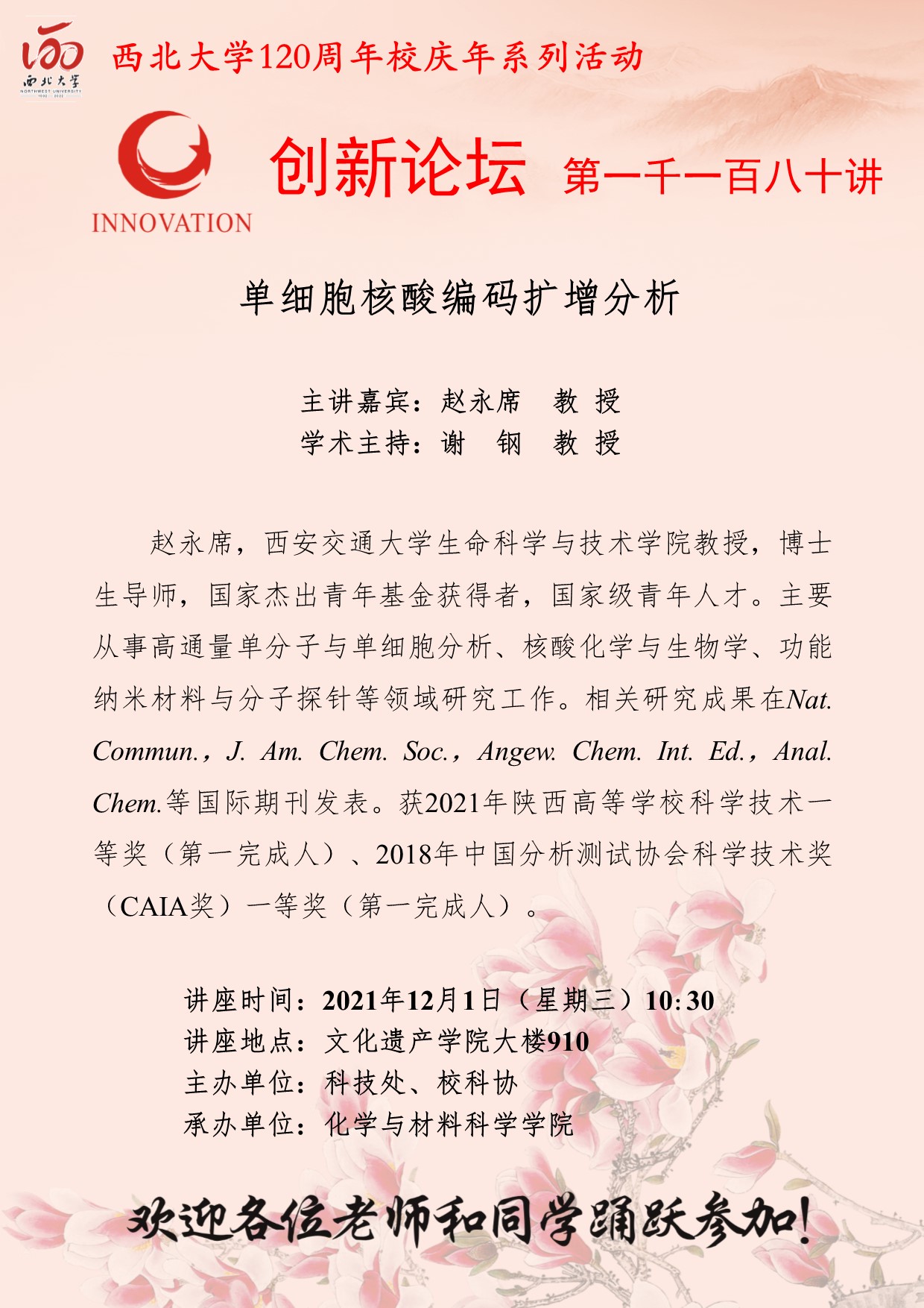 赵永席 教授 乐动网页版登录入口创新论坛第一千一百八十讲暨120周年校庆年系列活动:单细胞核酸编码扩增分析 讲座时间 2021年12月1日(星期三)10:30 讲座地点 文化遗产学院大楼910 讲座人介绍 赵永席 教授 讲座内容