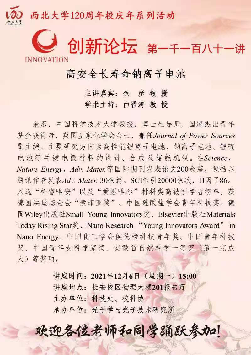 余彦 教授 乐动网页版登录入口创新论坛第一千一百八十一讲暨120周年校庆年系列活动:高安全长寿命钠离子电池 讲座时间 2021年12月6日(星期一)15:00 讲座地点 长安校区物理大楼201报告厅 讲座人介绍 余彦 教授 讲座内容