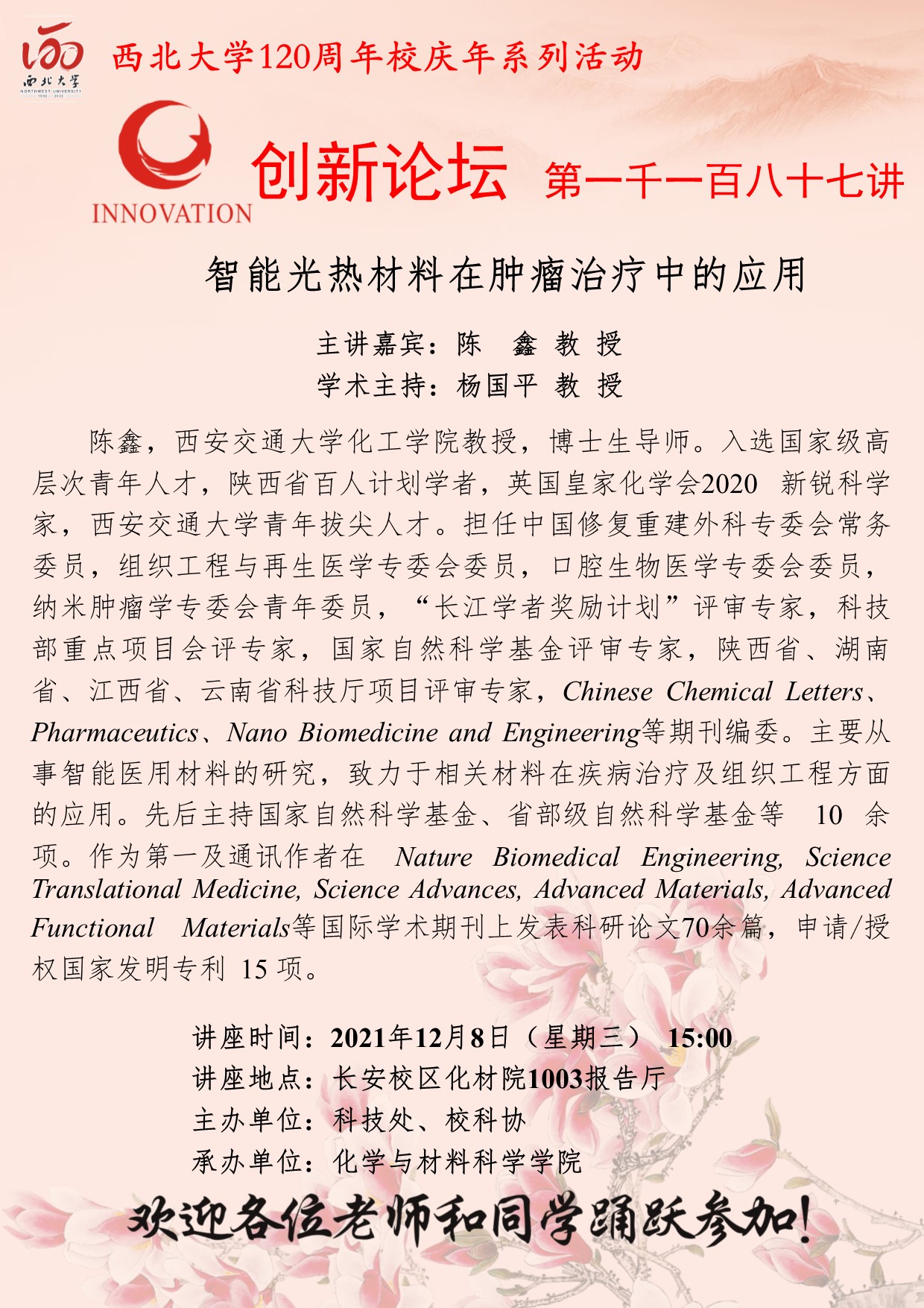 陈鑫 教授 乐动网页版登录入口创新论坛第一千一百八十七讲暨120周年校庆年系列活动:智能光热材料在肿瘤治疗中的应用 讲座时间 2021年12月8日(星期三) 15:00 讲座地点 长安校区化材院1003报告厅 讲座人介绍 陈鑫 教授 讲座内容
