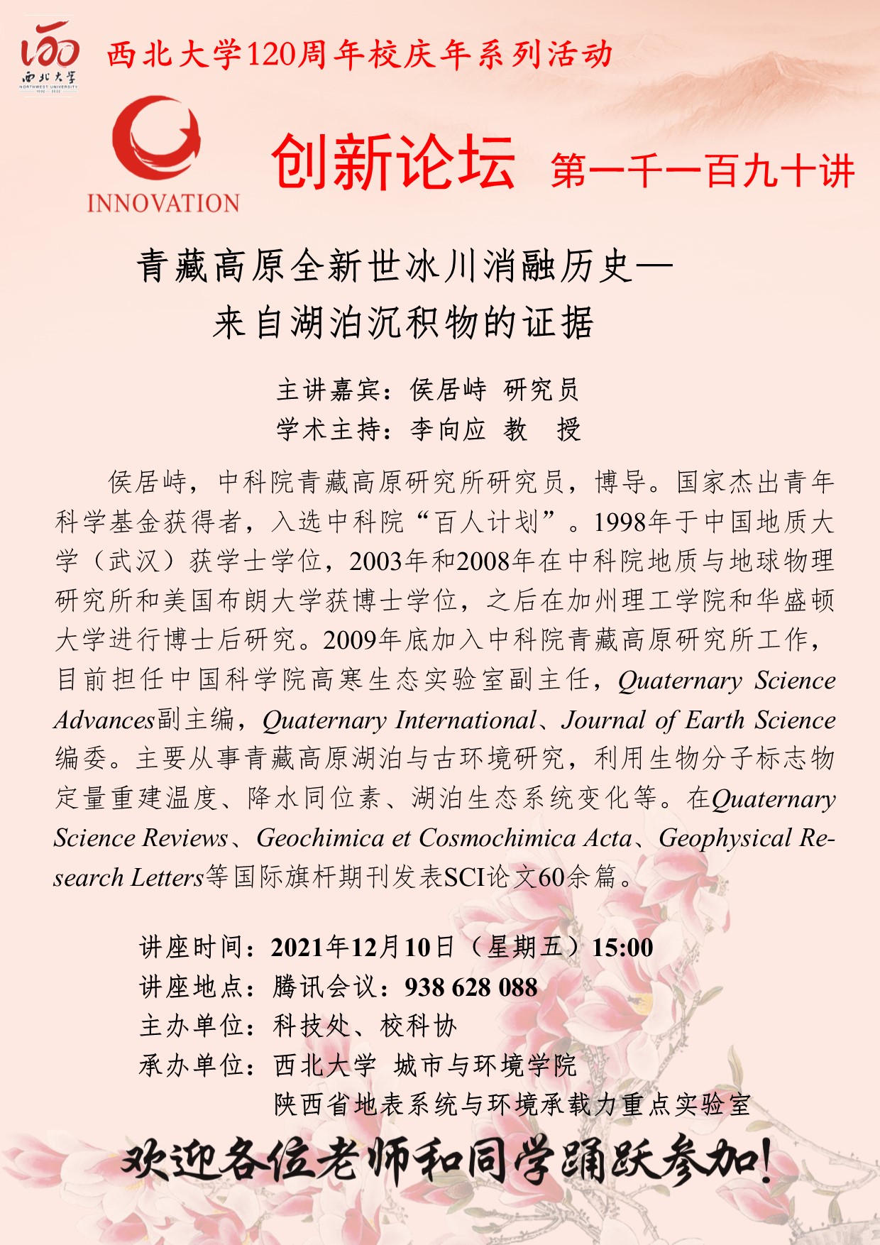 侯居峙 研究员 乐动网页版登录入口创新论坛第一千一百九十讲暨120周年校庆年系列活动:青藏高原全新世冰川消融历史—来自湖泊沉积物的证据 讲座时间 2021年12月10日(星期五)15:00 讲座地点 腾讯会议:938628088 讲座人介绍 侯居峙 研究员 讲座内容