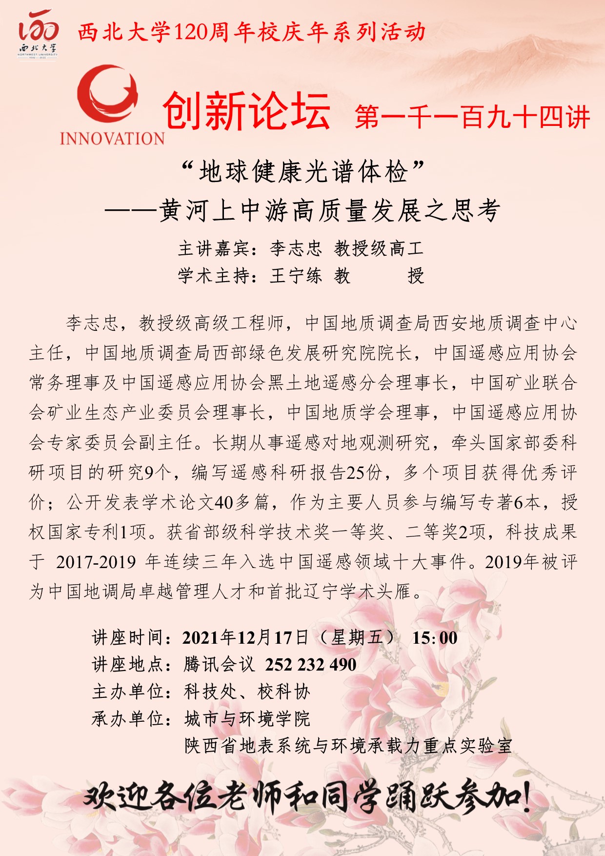 李志忠 教授级高工 乐动网页版登录入口创新论坛第一千一百九十四讲暨120周年校庆年系列活动:“地球健康光谱体检”——黄河上中游高质量发展之思考 讲座时间 2021年12月17日(星期五) 15:00 讲座地点 腾讯会议 252232490 讲座人介绍 李志忠 教授级高工 讲座内容