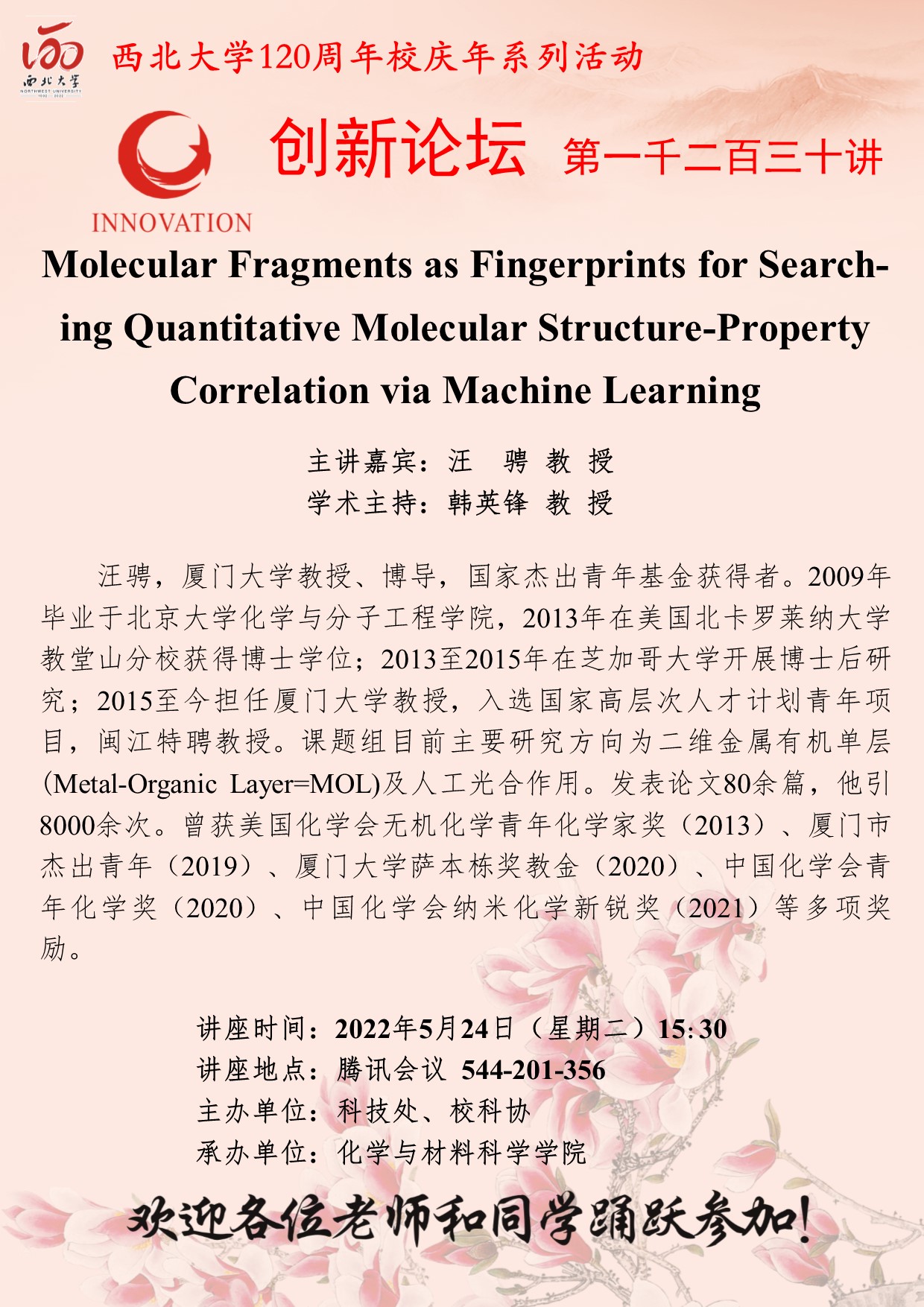 汪骋 教授 乐动网页版登录入口创新论坛第一千二百三十讲暨120周年校庆年系列活动:Molecular Fragments as Fingerprints for Searching Quantitative Molecular Structure-Property Correlation via Machine Learning 讲座时间 2022年5月24日(星期二)15:30 讲座地点 腾讯会议 544-201-356 讲座人介绍 汪骋 教授 讲座内容