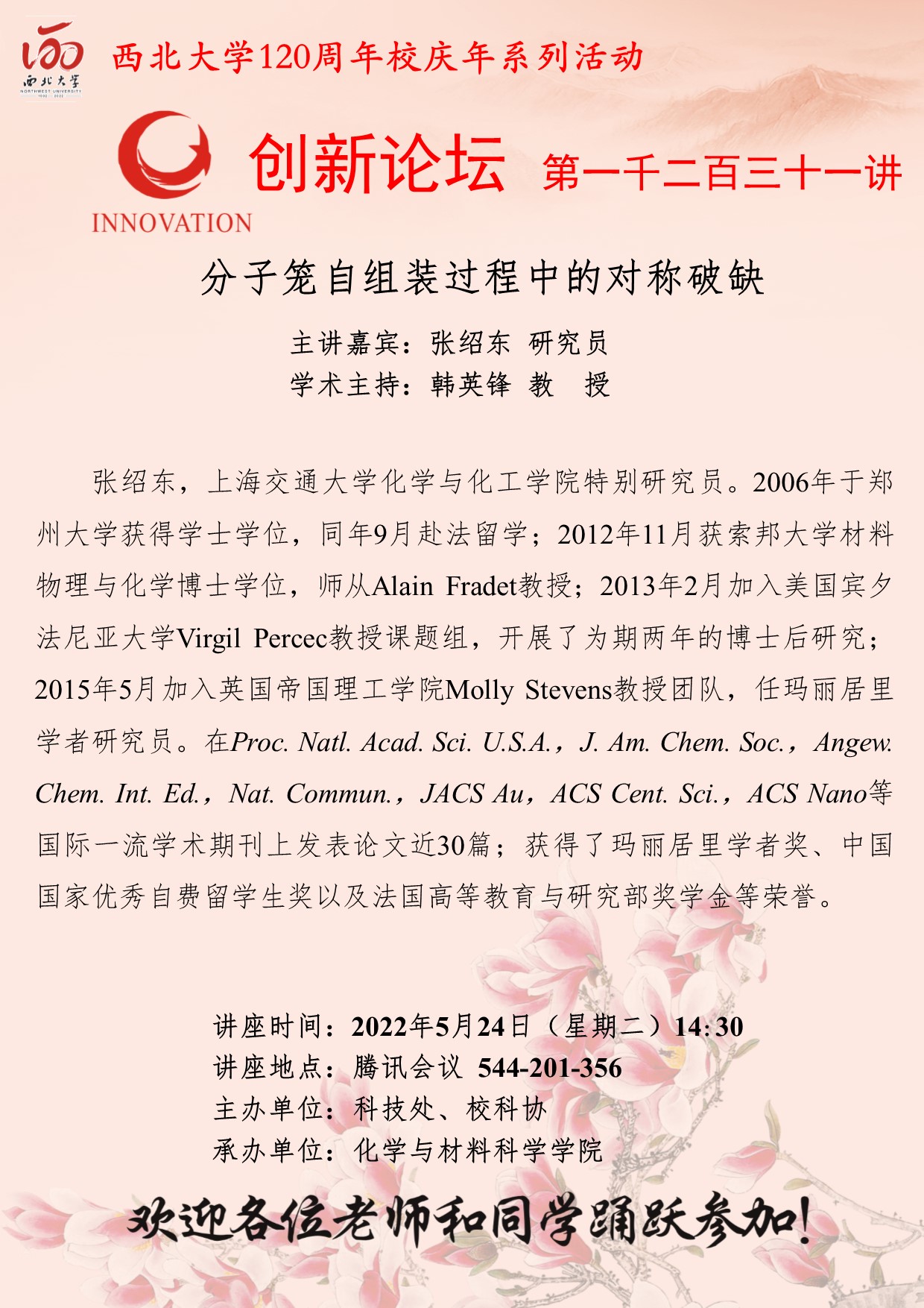 张绍东 研究员 乐动网页版登录入口创新论坛第一千二百三十一讲暨120周年校庆年系列活动:分子笼自组装过程中的对称破缺 讲座时间 2022年5月24日(星期二)14:30 讲座地点 腾讯会议 544-201-356 讲座人介绍 张绍东 研究员 讲座内容