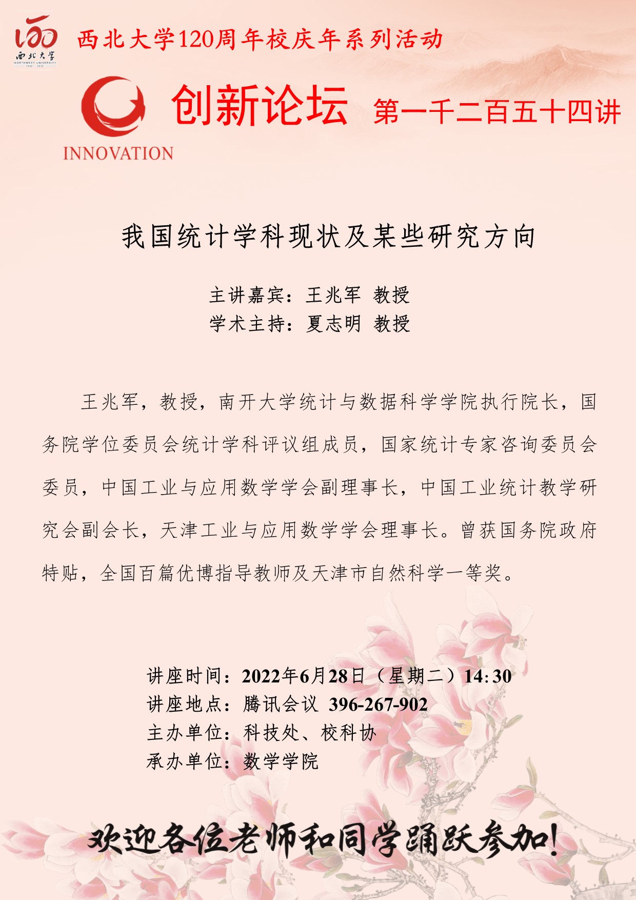 王兆军 教授 乐动网页版登录入口创新论坛第一千二百五十四讲暨120周年校庆年系列活动:我国统计学科现状及某些研究方向 讲座时间 2022年6月28日(星期二)14:30 讲座地点 腾讯会议 396-267-902 讲座人介绍 王兆军 教授 讲座内容