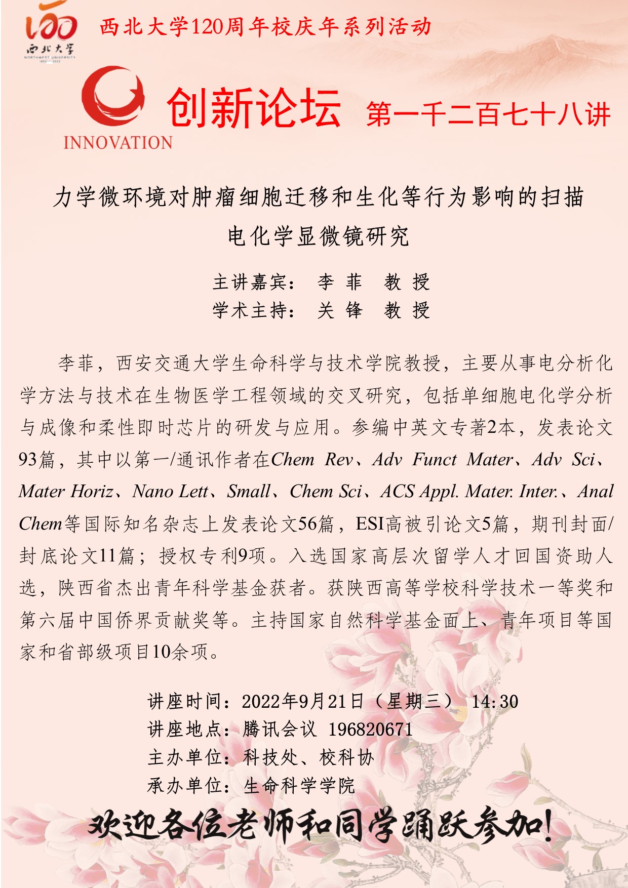 李 菲 教 授 乐动网页版登录入口创新论坛第一千二百七十八讲暨120周年校庆年系列活动:力学微环境对肿瘤细胞迁移和生化等行为影响的扫描电化学显微镜研究 讲座时间 2022年9月21日(星期三) 14:30 讲座地点 腾讯会议 196820671 讲座人介绍 李 菲 教 授 讲座内容