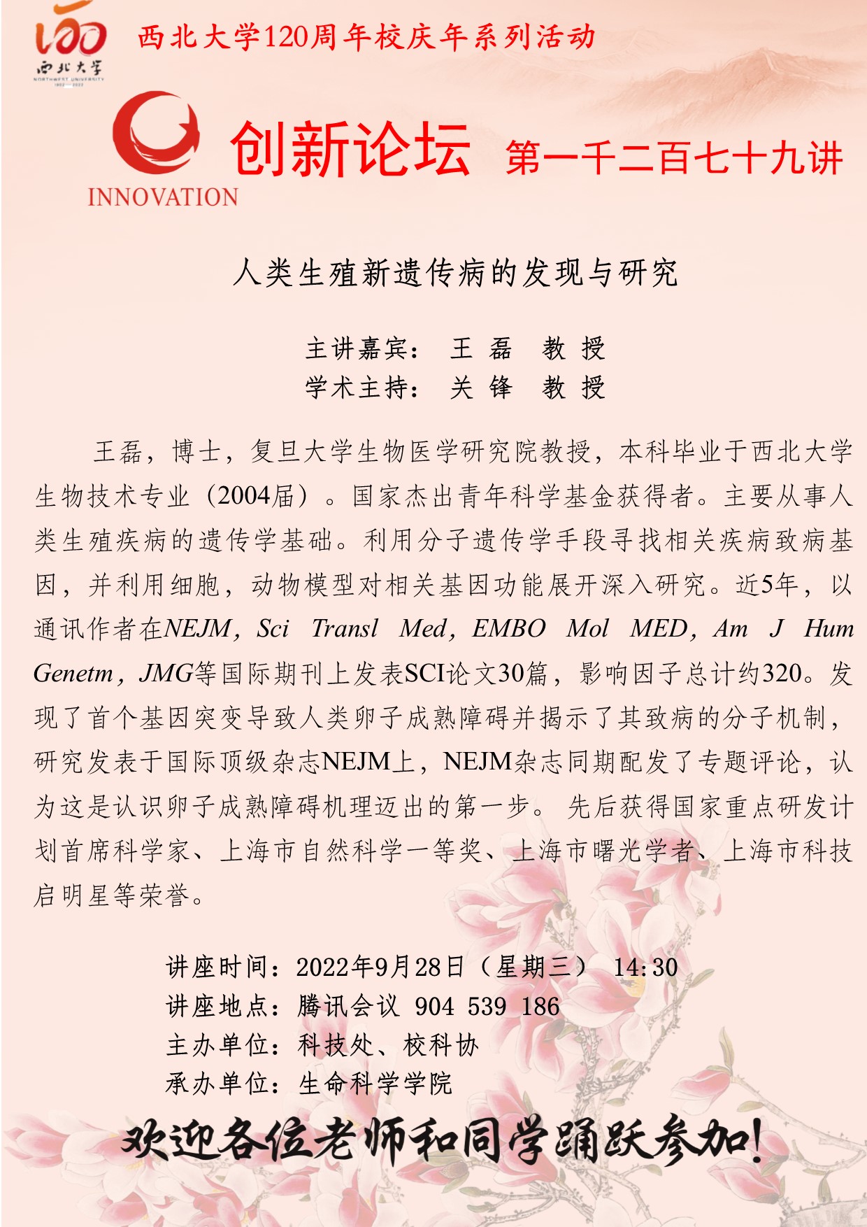 王 磊 教 授 乐动网页版登录入口创新论坛第一千二百七十九讲暨120周年校庆年系列活动:人类生殖新遗传病的发现与研究 讲座时间 2022年9月28日(星期三) 14:30 讲座地点 腾讯会议 904 539 186 讲座人介绍 王 磊 教 授 讲座内容