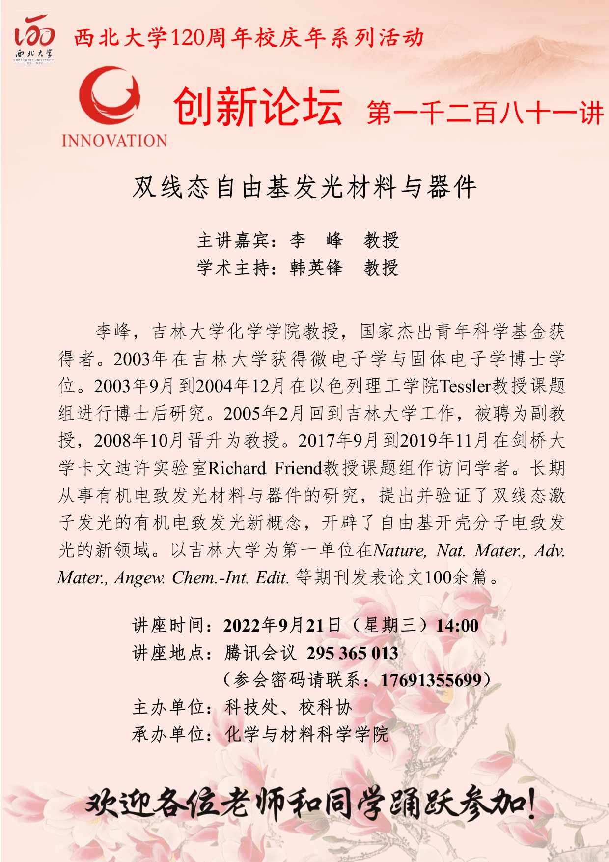 李峰 教授 乐动网页版登录入口创新论坛第一千二百八十一讲暨120周年校庆年系列活动: 双线态自由基发光材料与器件 讲座时间 2022年9月21日(星期三) 14:00 讲座地点 腾讯会议ID:295 365 013 (参会密码请联系:17691355699) 讲座人介绍 李峰 教授 讲座内容