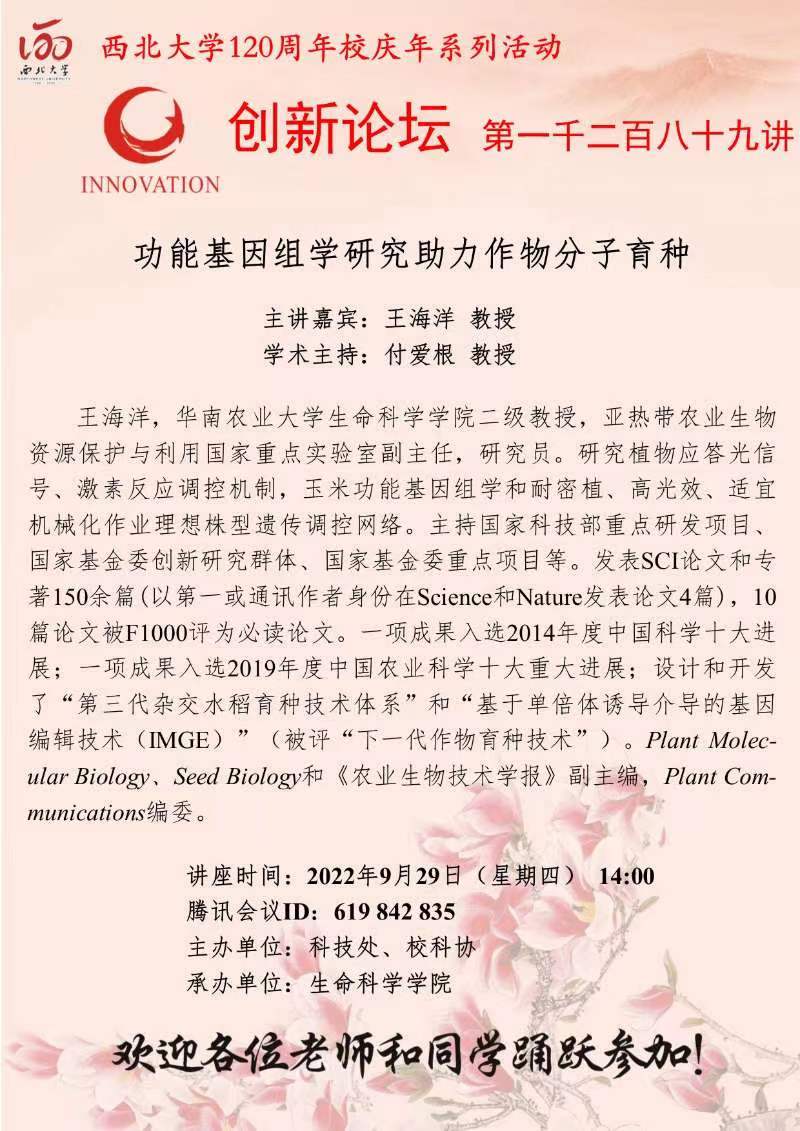 王海洋 教授 乐动网页版登录入口创新论坛第一千二百八十九讲暨120周年校庆年系列活动: 功能基因组学研究助力作物分子育种 讲座时间 2022年9月29日(星期四) 14:00 讲座地点 腾讯会议 619 842 835 讲座人介绍 王海洋 教授 讲座内容