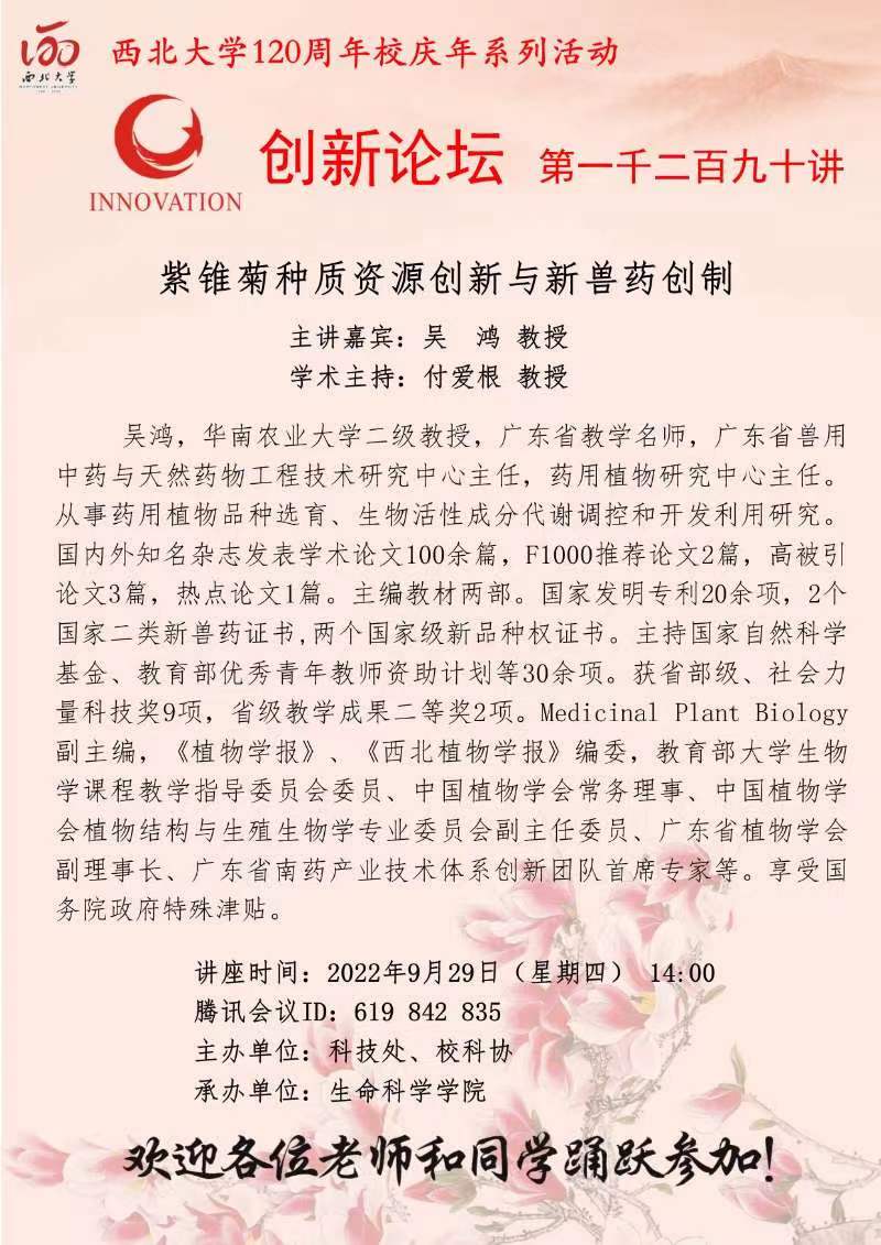 吴 鸿 教授 乐动网页版登录入口创新论坛第一千二百九十讲暨120周年校庆年系列活动: 紫锥菊种质资源创新与新兽药创制 讲座时间 2022年9月29日(星期四) 14:00 讲座地点 腾讯会议 619 842 835 讲座人介绍 吴 鸿 教授 讲座内容