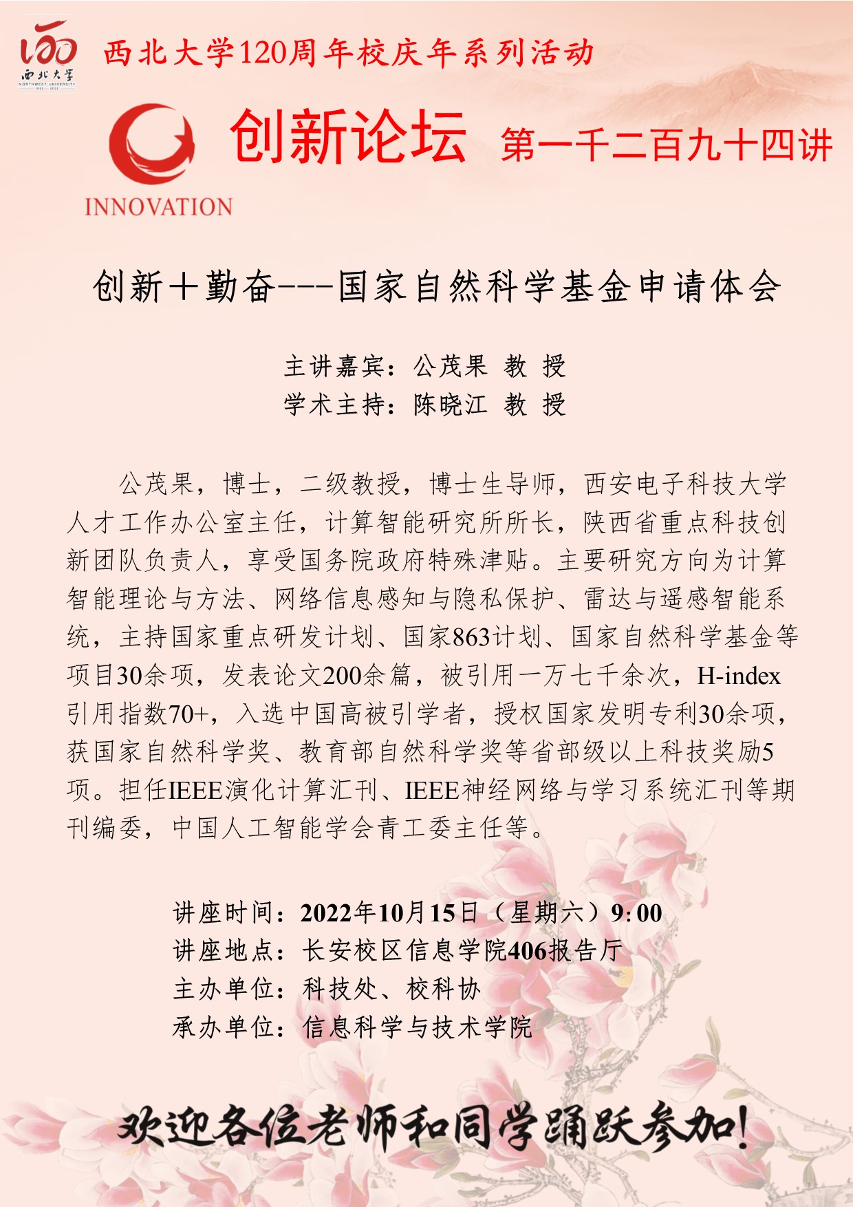 公茂果 教授 乐动网页版登录入口创新论坛第一千二百九十四讲暨120周年校庆年系列活动: 创新+勤奋——国家自然科学基金申请体会 讲座时间 2022年10月15日(星期六)9:00 讲座地点 长安校区信息学院406报告厅 讲座人介绍 公茂果 教授 讲座内容