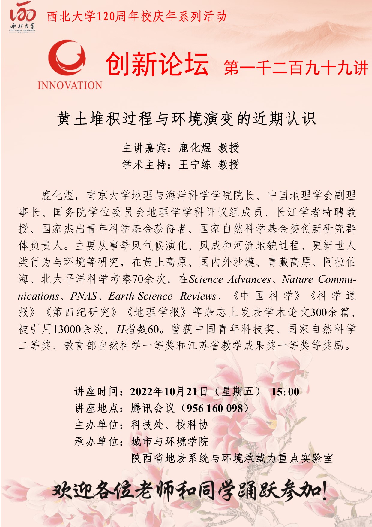 鹿化煜 教授 乐动网页版登录入口创新论坛第一千二百九十九讲暨120周年校庆年系列活动:黄土堆积过程与环境演变的近期认识 讲座时间 2022年10月21日(星期五) 15:00 讲座地点 腾讯会议(956 160 098) 讲座人介绍 鹿化煜 教授 讲座内容