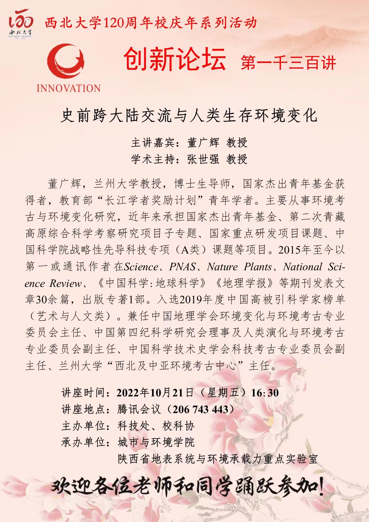 董广辉 教授 乐动网页版登录入口创新论坛第一千三百讲暨120周年校庆年系列活动: 史前跨大陆交流与人类生存环境变化 讲座时间 2022年10月21日(星期五)16:30 讲座地点 腾讯会议 206 743 443 讲座人介绍 董广辉 教授 讲座内容