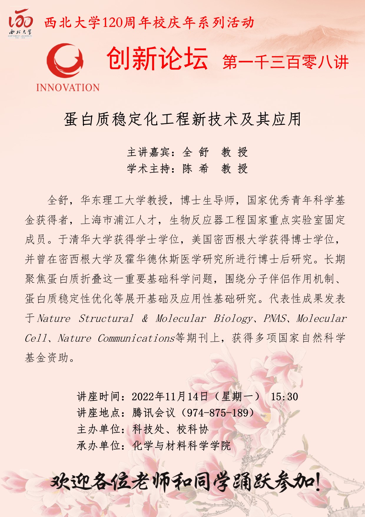 全舒 教授 乐动网页版登录入口创新论坛第一千三百零八讲暨120周年校庆年系列活动: 蛋白质稳定化工程新技术及其应用 讲座时间 2022年11月14日(星期一)15:30 讲座地点 腾讯会议(974 875 189) 讲座人介绍 全舒 教授 讲座内容