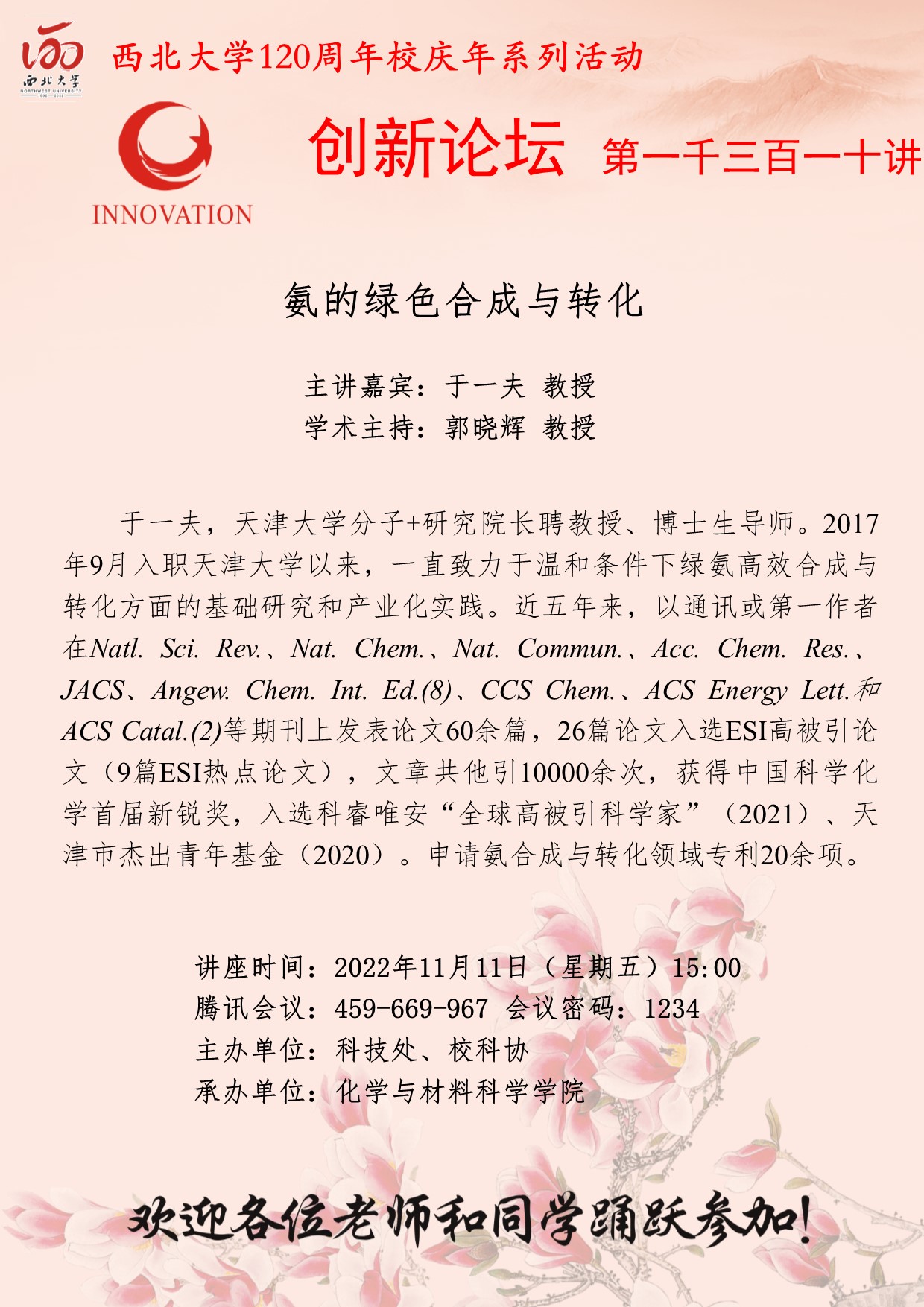于一夫 教授 乐动网页版登录入口创新论坛第一千三百一十讲暨120周年校庆年系列活动: 氨的绿色合成与转化 讲座时间 2022年11月11日(星期五)15:00 讲座地点 腾讯会议(459-669-967) 密码 1234 讲座人介绍 于一夫 教授 讲座内容