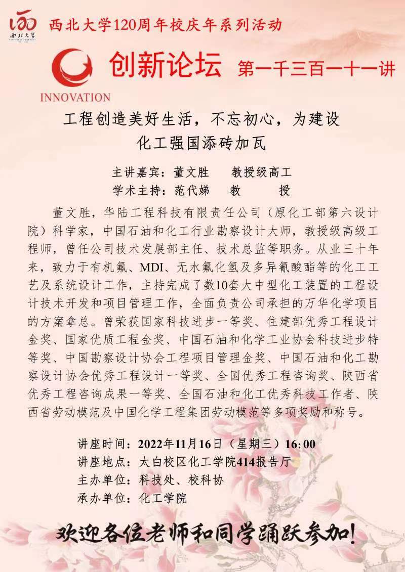 董文胜 教授级高工 乐动网页版登录入口创新论坛第一千三百一十一讲暨120周年校庆年系列活动: 工程创造美好生活,不忘初心,为建设化工强国添砖加瓦 讲座时间 2022年11月16日(星期三)16:00 讲座地点 太白校区化工学院414报告厅 讲座人介绍 董文胜 教授级高工 讲座内容