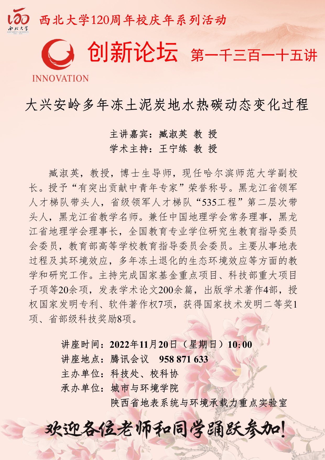 臧淑英 教授 乐动网页版登录入口创新论坛第一千三百一十五讲暨120周年校庆年系列活动: 大兴安岭多年冻土泥炭地水热碳动态变化过程 讲座时间 2022年11月20日(星期日)10:00 讲座地点 腾讯会议 958 871 633 讲座人介绍 臧淑英 教授 讲座内容