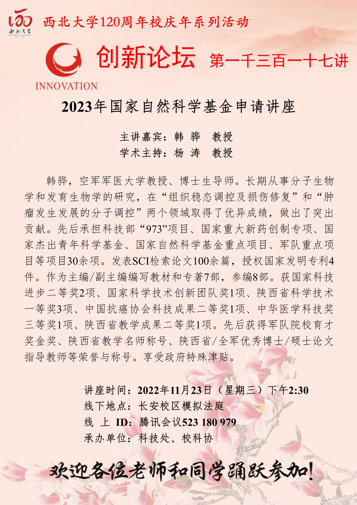韩骅 教授 乐动网页版登录入口创新论坛第一千三百一十七讲暨120周年校庆年系列活动:2023年国家自然科学基金申请讲座 讲座时间 2022年11月23日(星期三)下午2:30 讲座地点 长安校区模拟法庭 讲座人介绍 韩骅 教授 讲座内容