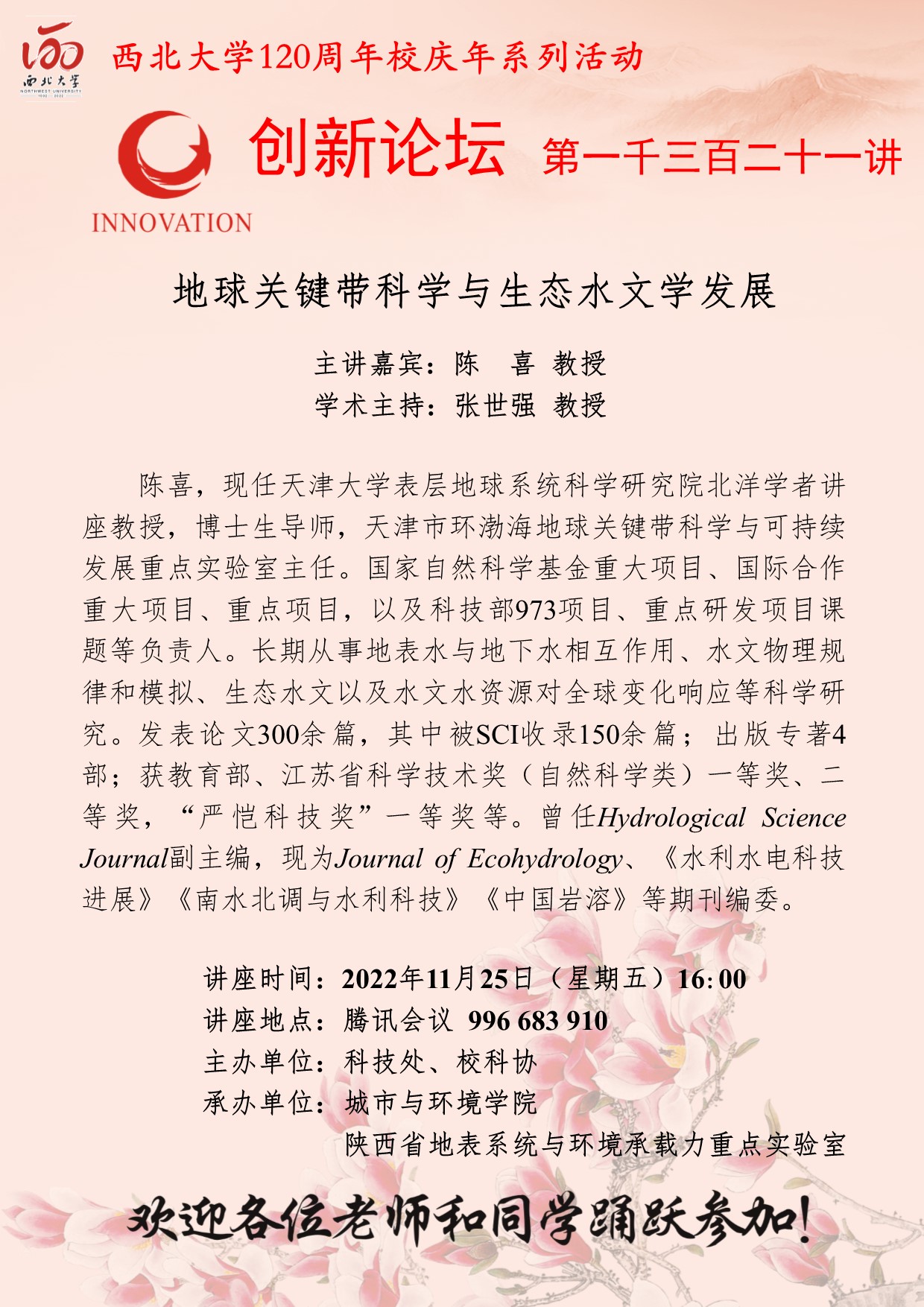 陈喜 教授 乐动网页版登录入口创新论坛第一千三百二十一讲暨120周年校庆年系列活动:地球关键带科学与生态水文学发展 讲座时间 2022年11月25日(星期五)16:00 讲座地点 腾讯会议 996 683 910 讲座人介绍 陈喜 教授 讲座内容