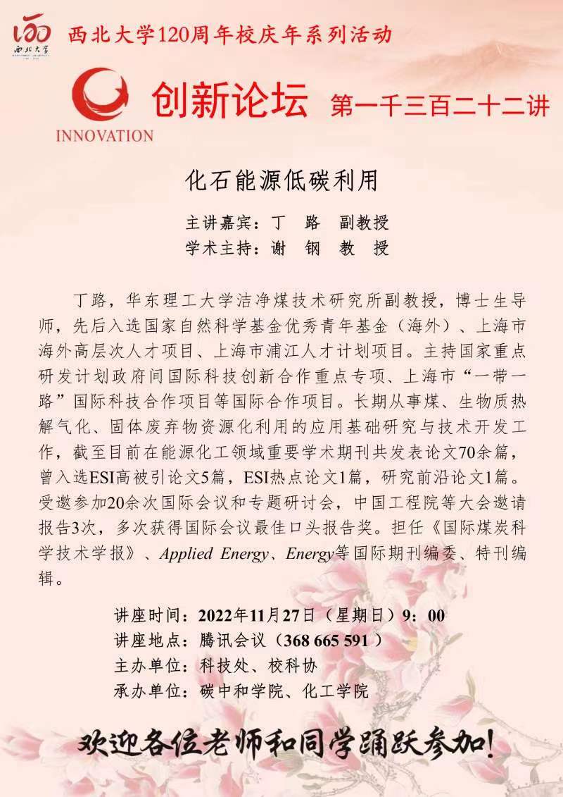 丁路 副教授 乐动网页版登录入口创新论坛第一千三百二十二讲暨120周年校庆年系列活动: 化石能源低碳利用 讲座时间 2022年11月27日(星期日) 9:00 讲座地点 腾讯会议368 665 591 讲座人介绍 丁路 副教授 讲座内容