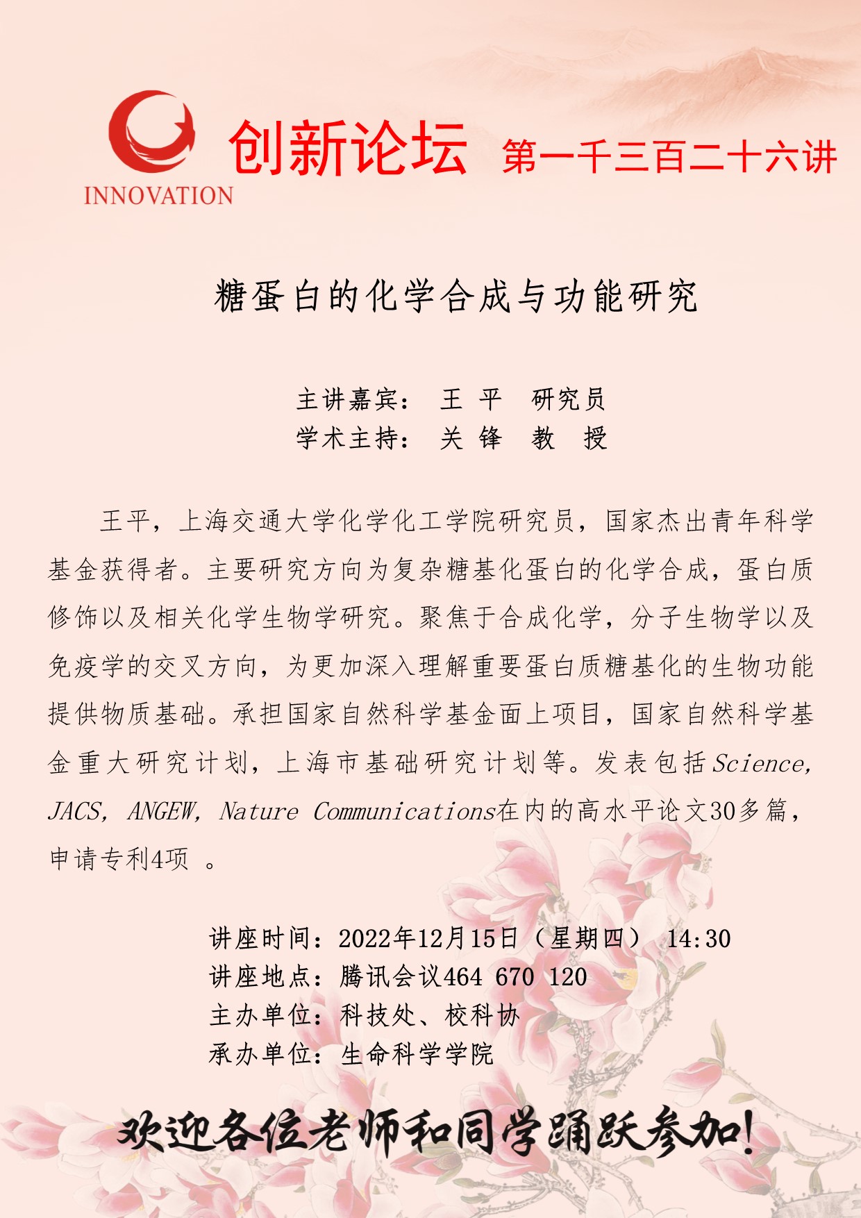 王平 研究员 乐动网页版登录入口创新论坛第一千三百二十六讲:糖蛋白的化学合成与功能究 讲座时间 2022年12月15日(星期四) 14:30 讲座地点 腾讯会议464 670 120 讲座人介绍 王平 研究员 讲座内容