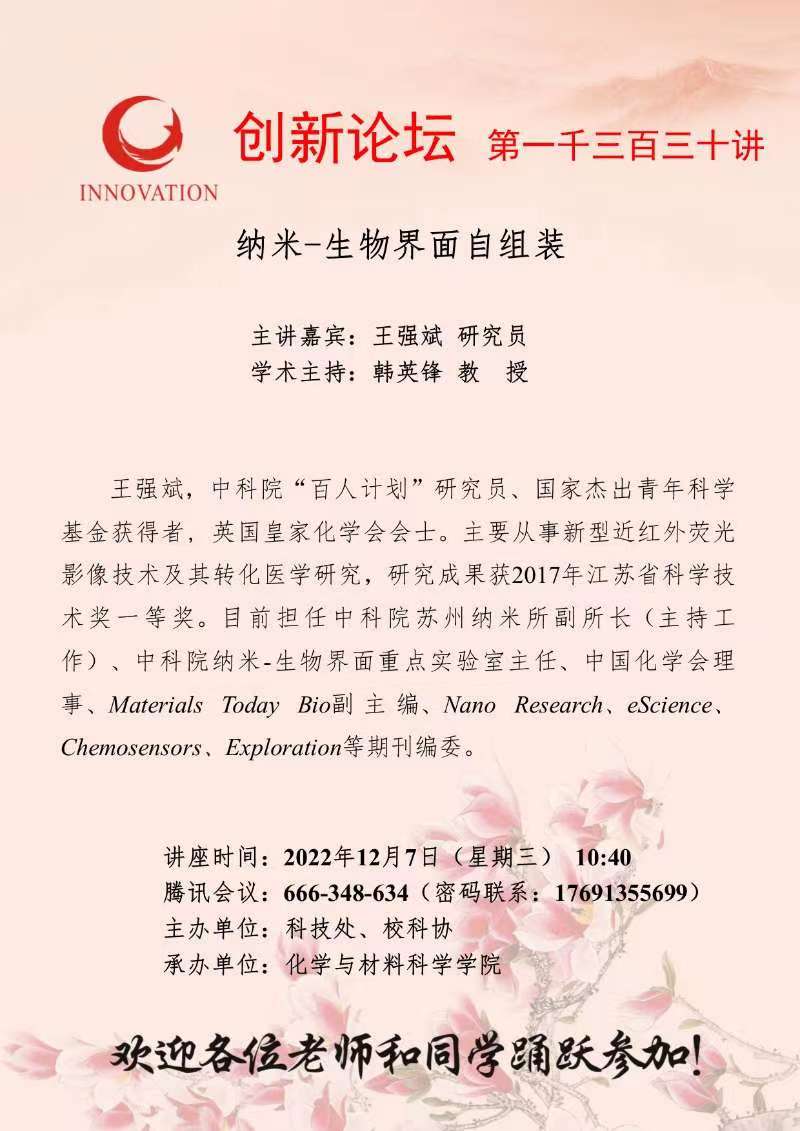 王强斌 研究员 乐动网页版登录入口创新论坛第一千三百三十讲:纳米-生物界面自组装 讲座时间 2022年12月7日(星期三) 10:40 讲座地点 腾讯会议:666-348-634 讲座人介绍 王强斌 研究员 讲座内容