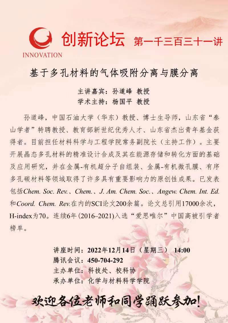孙道峰 教授 乐动网页版登录入口创新论坛第一千三百三十一讲:基于多孔材料的气体吸附分离与膜分离 讲座时间 2022年12月14日(星期三) 14:00 讲座地点 腾讯会议:450-704-292 讲座人介绍 孙道峰 教授 讲座内容