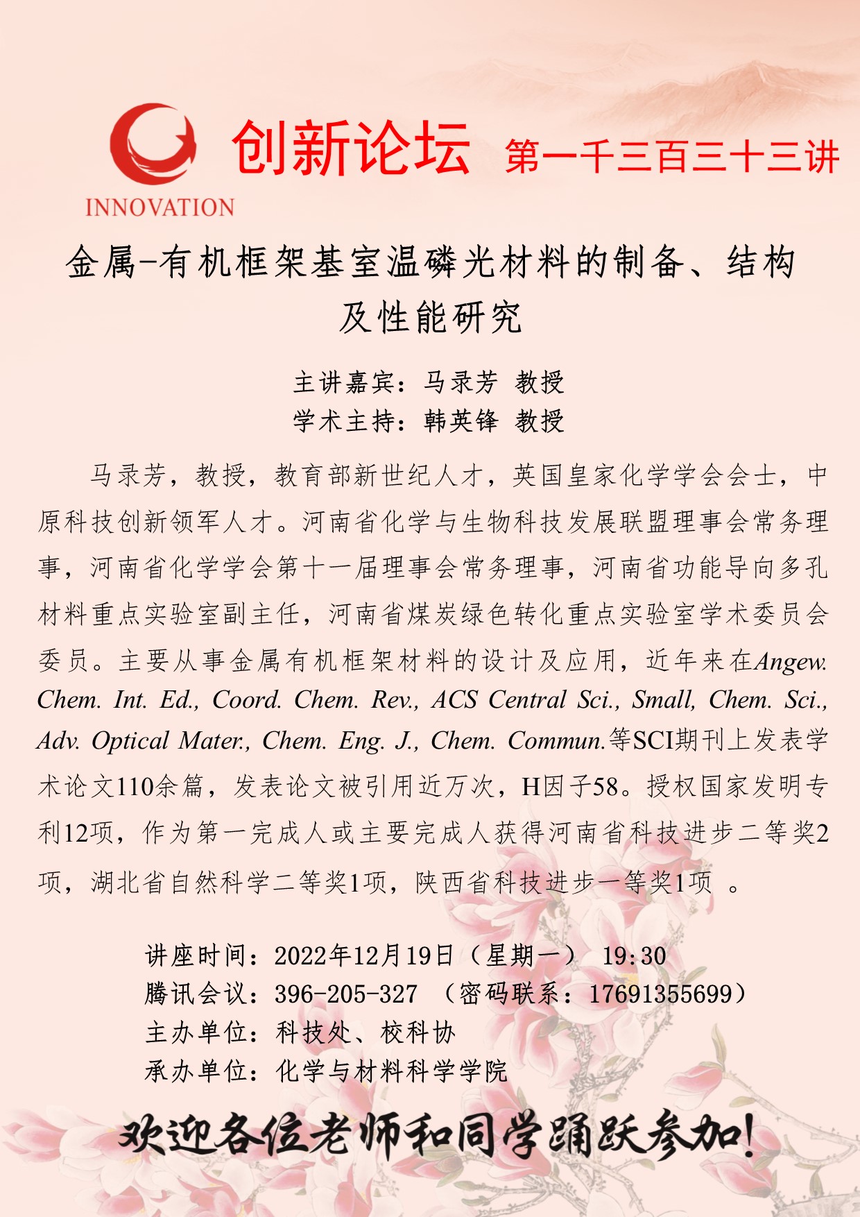 马录芳 教授 乐动网页版登录入口创新论坛第一千三百三十三讲:金属-有机框架基室温磷光材料的制备、结构及性能研究 讲座时间 2022年12月19日(星期一) 19:30 讲座地点 腾讯会议:396-205-327 讲座人介绍 马录芳 教授 讲座内容