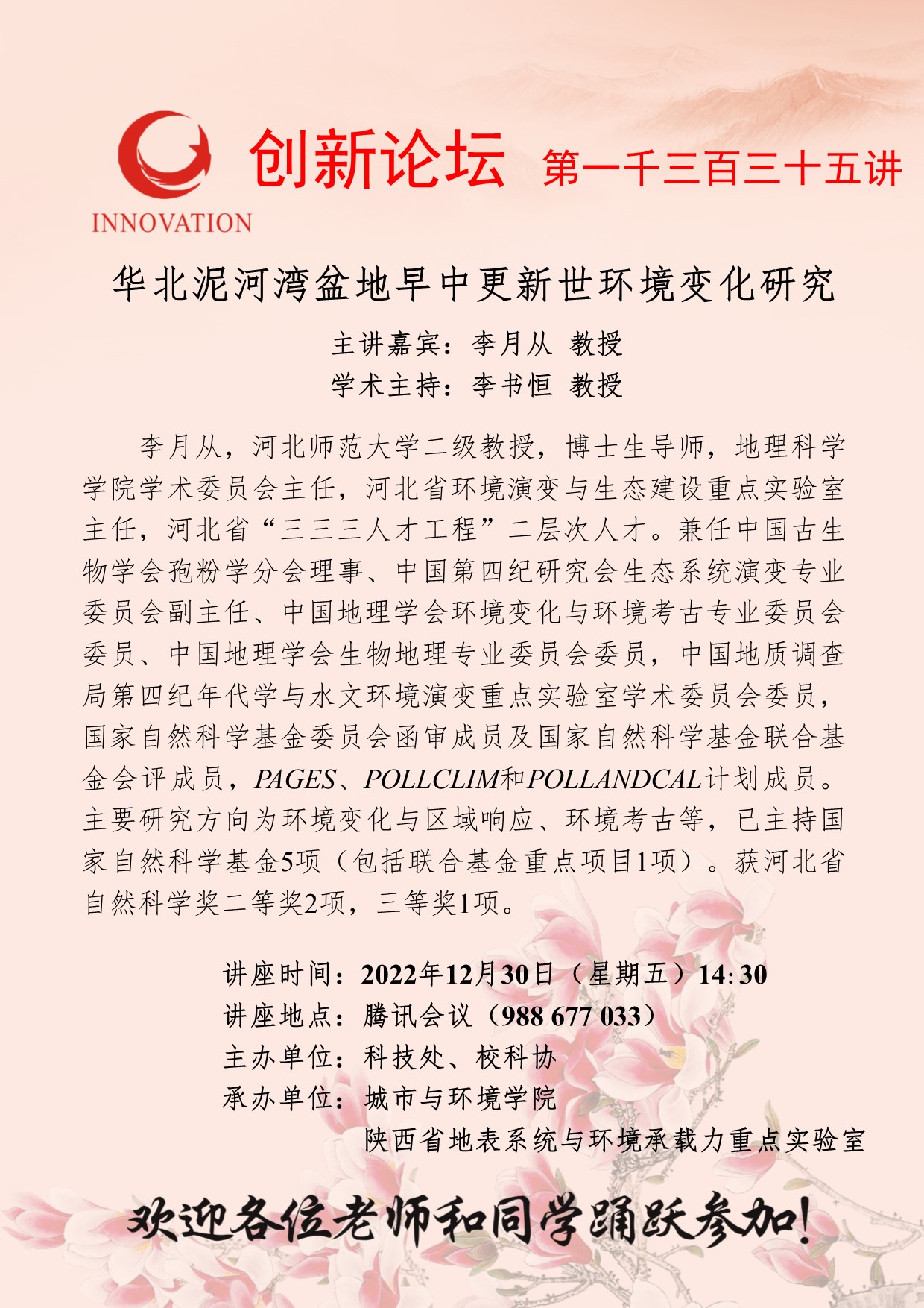 李月从 教授 乐动网页版登录入口创新论坛第一千三百三十五讲:华北泥河湾盆地早中更新世环境变化研究 讲座时间 2022年12月30日(星期五)14:30 讲座地点 腾讯会议(988 677 033) 讲座人介绍 李月从 教授 讲座内容