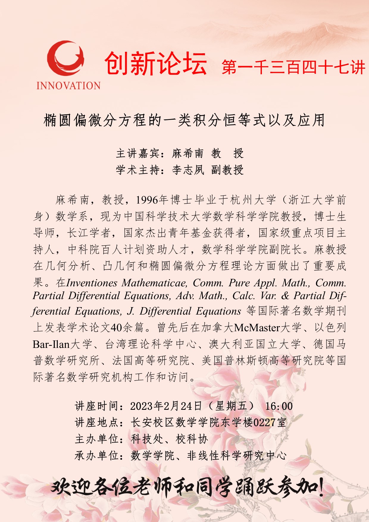 麻希南 教授 乐动网页版登录入口创新论坛第一千三百四十七讲: 椭圆偏微分方程的一类积分恒等式以及应用 讲座时间 2023年2月24日(星期五)16:00 讲座地点 长安校区数学学院东学楼0227室 讲座人介绍 麻希南 教授 讲座内容