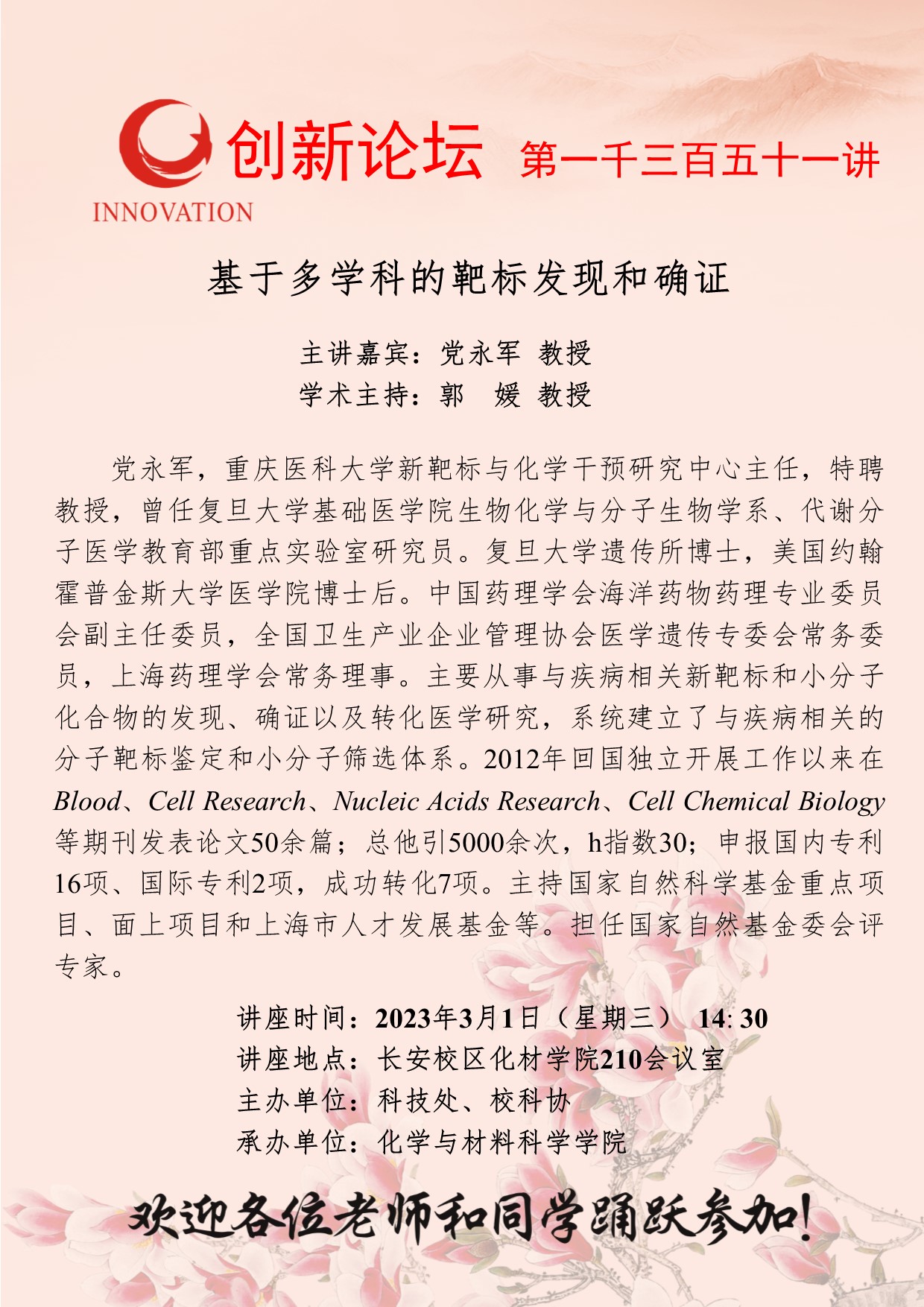 党永军 教授 乐动网页版登录入口创新论坛第一千三百五十一讲:基于多学科的靶标发现和确证 讲座时间 2023年3月1日(星期三) 14: 30 讲座地点 长安校区化材学院210会议室 讲座人介绍 党永军 教授 讲座内容