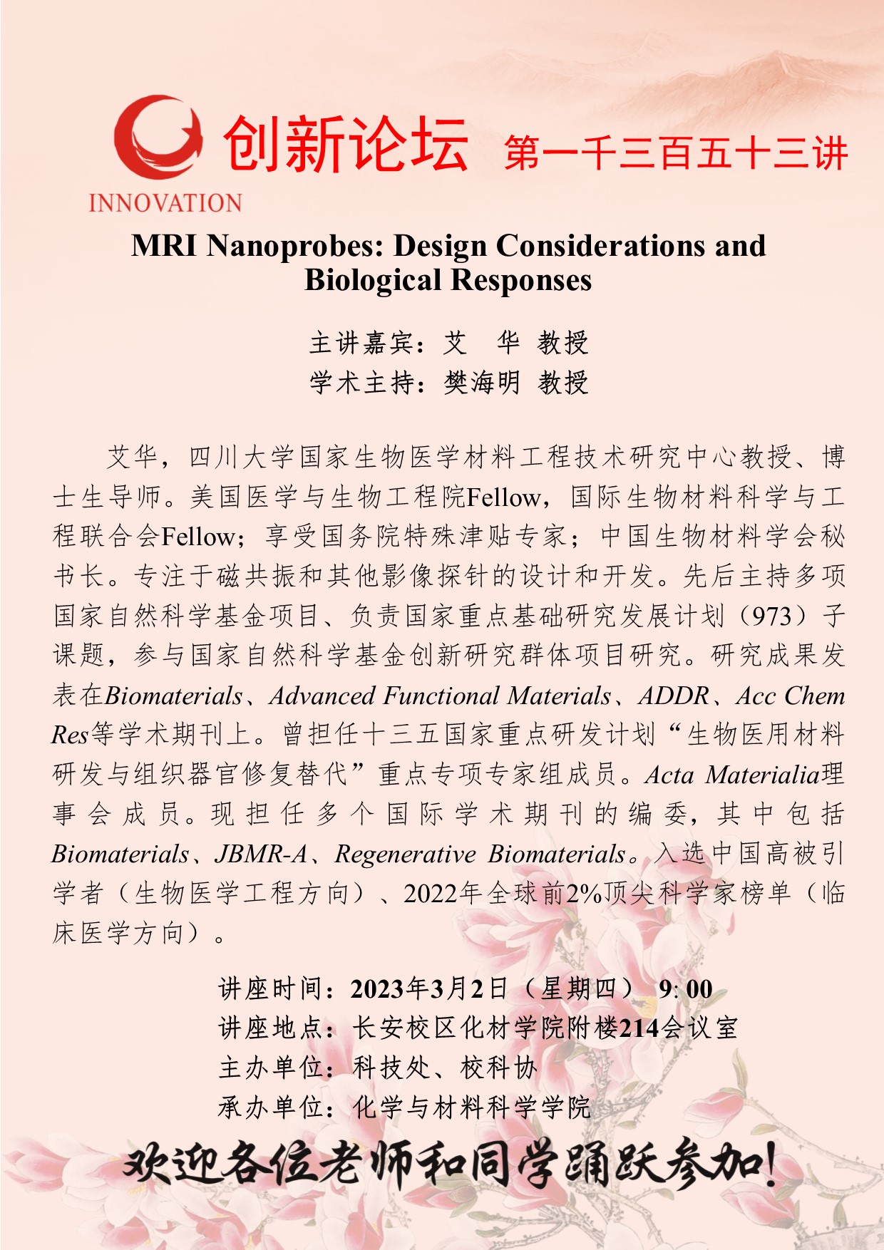 艾华 教授 乐动网页版登录入口创新论坛第一千三百五十三讲:MRI Nanoprobes: Design Considerations and Biological Responses 讲座时间 2023年3月2日(星期四) 9: 00 讲座地点 长安校区化材学院附楼214会议室 讲座人介绍 艾华 教授 讲座内容