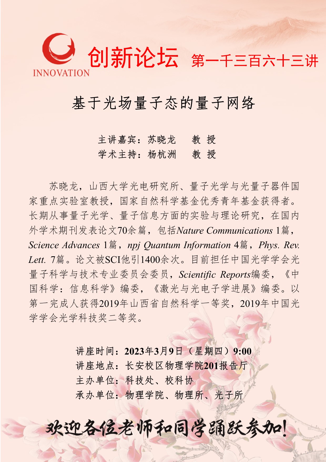 苏晓龙 教授 乐动网页版登录入口创新论坛第一千三百六十三讲:基于光场量子态的量子网络 讲座时间 2023年3月9日(星期四)9:00 讲座地点 长安校区物理学院201报告厅 讲座人介绍 苏晓龙 教授 讲座内容