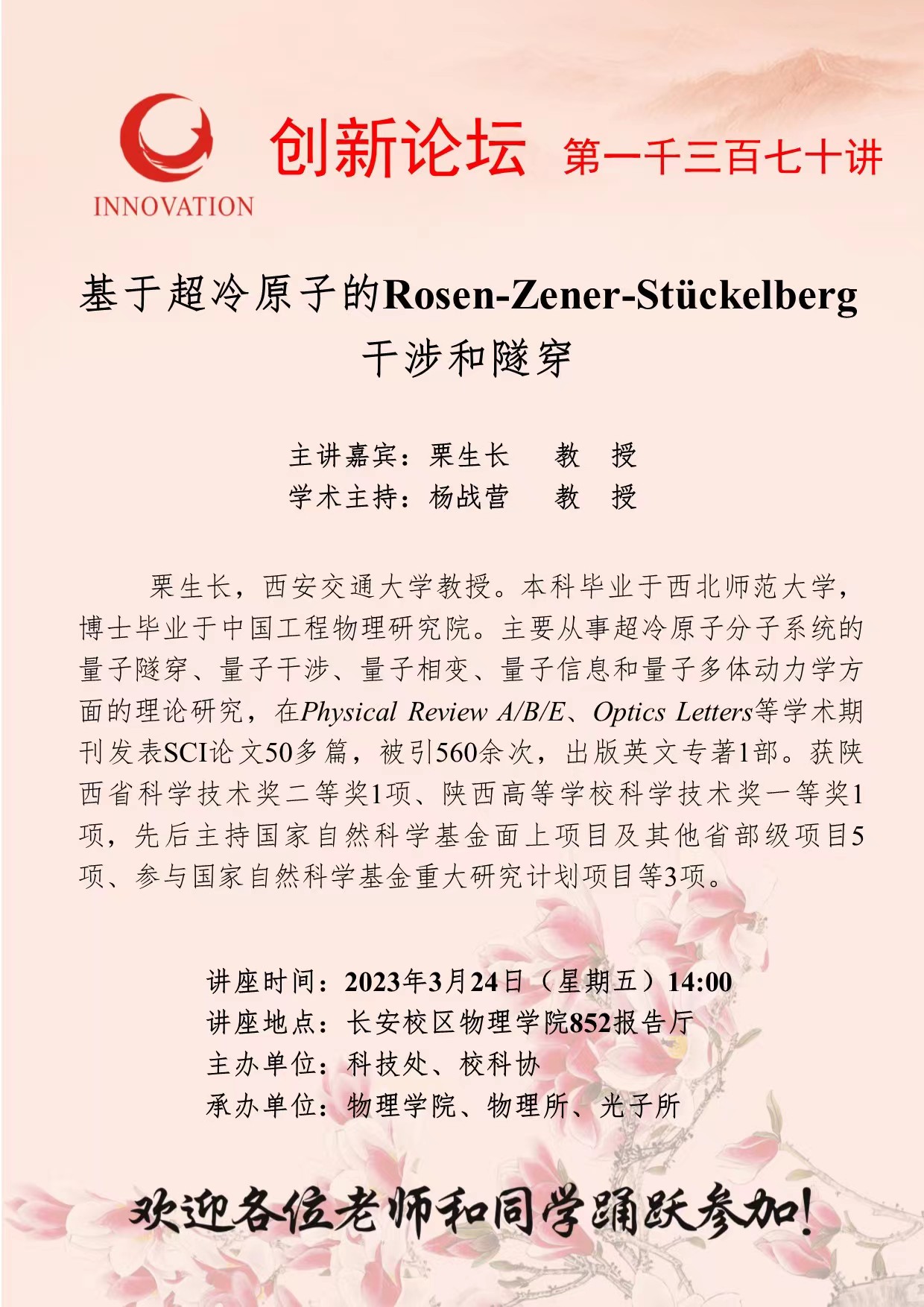 栗生长 教 授 乐动网页版登录入口创新论坛第一千三百七十讲:基于超冷原子的Rosen-Zener-Stückelberg干涉和隧穿 讲座时间 2023年3月24日(星期五)14:00 讲座地点 长安校区物理学院852报告厅 讲座人介绍 栗生长 教 授 讲座内容