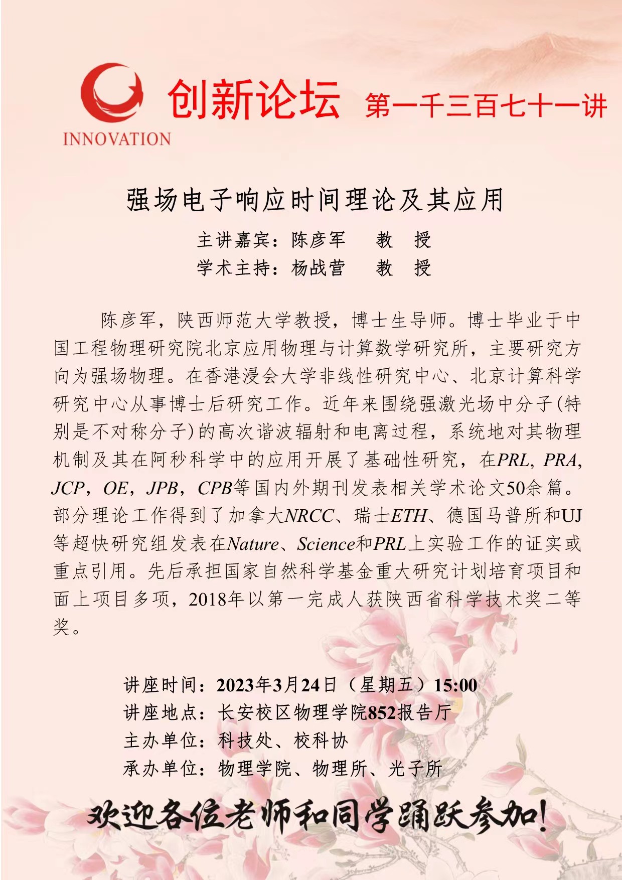 陈彦军 教 授 乐动网页版登录入口创新论坛第一千三百七十一讲:强场电子响应时间理论及其应用 讲座时间 2023年3月24日(星期五)15:00 讲座地点 长安校区物理学院852报告厅 讲座人介绍 陈彦军 教 授 讲座内容