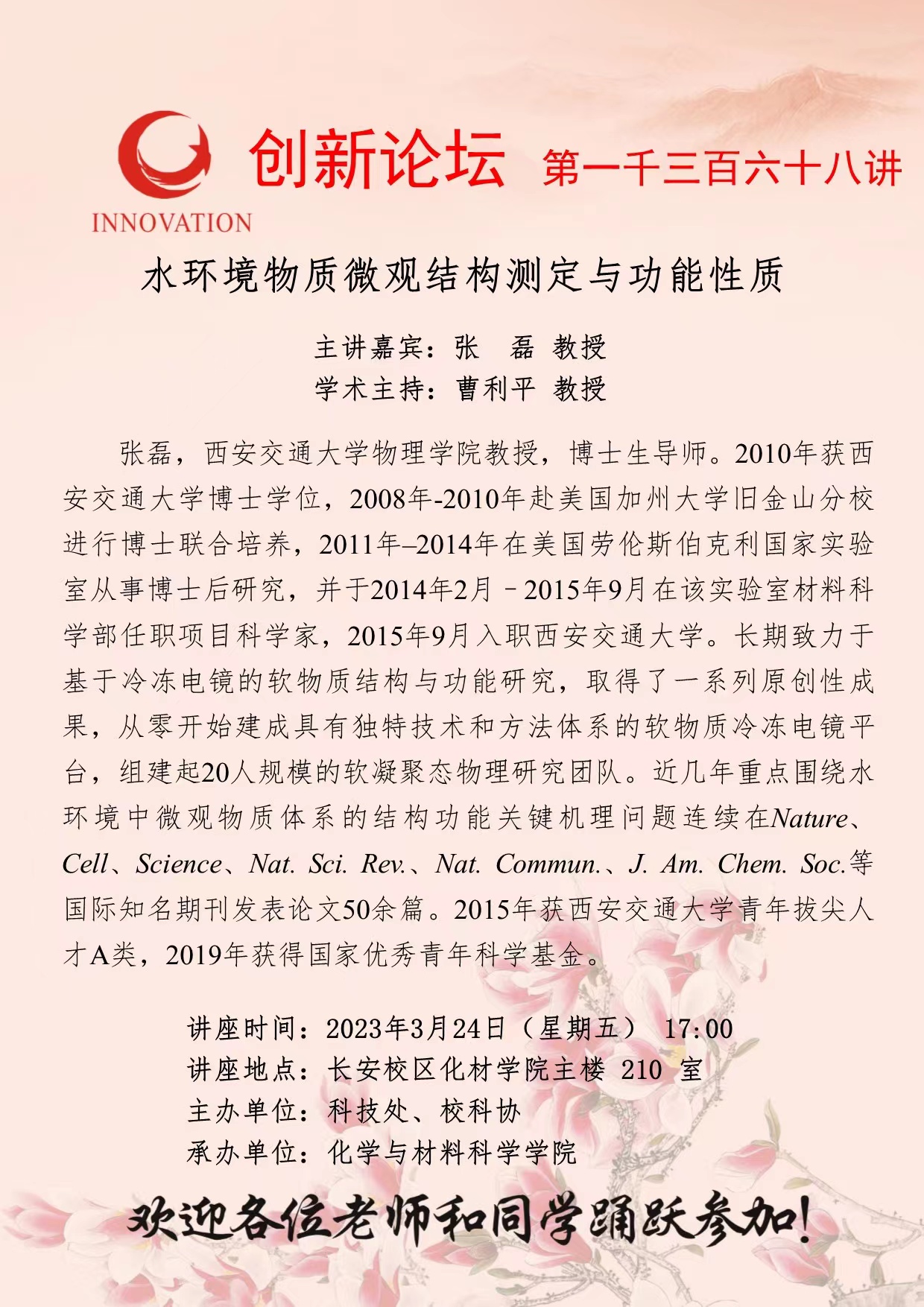 张磊 教授 乐动网页版登录入口创新论坛第一千三百六十八讲:水环境物质微观结构测定与功能性质机理 讲座时间 2023年3月24日(星期五) 17:00 讲座地点 长安校区化材学院主楼 210 室 讲座人介绍 张磊 教授 讲座内容