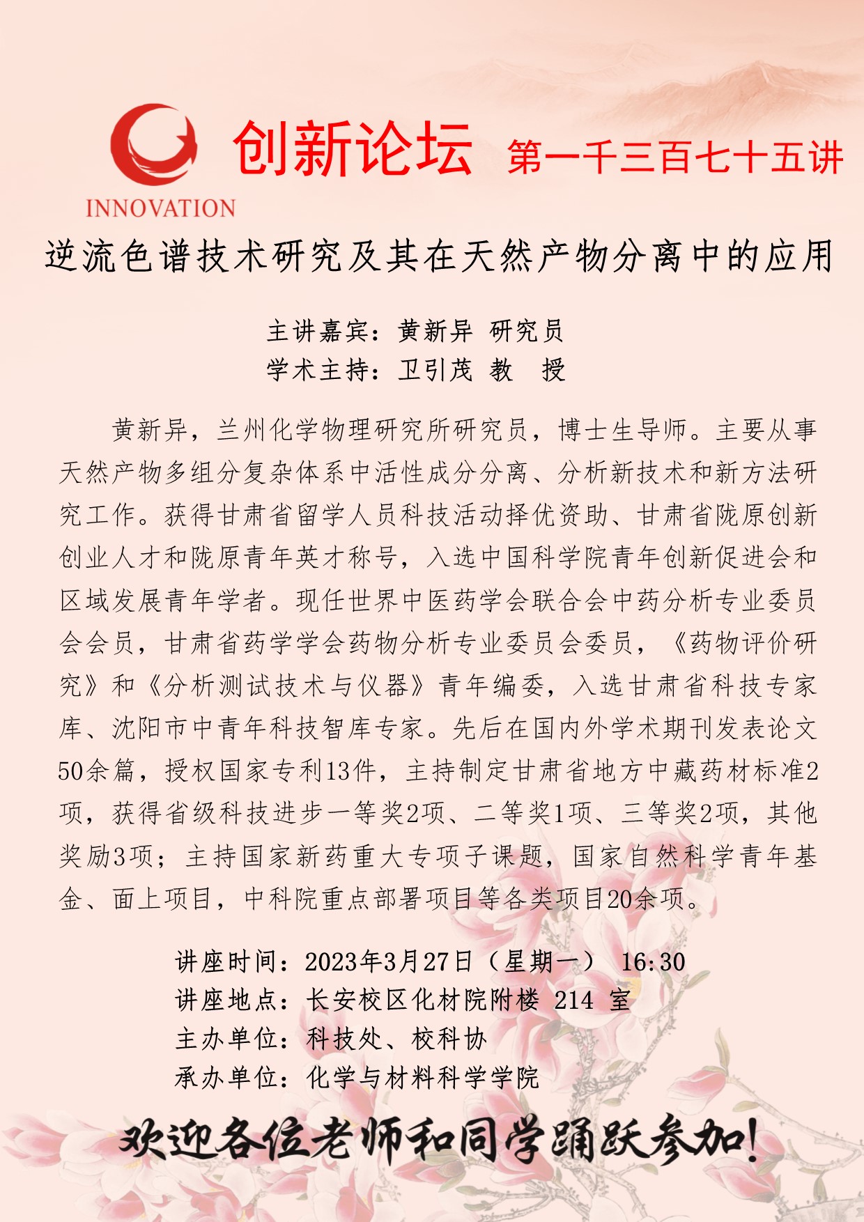 黄新异 研究员 乐动网页版登录入口创新论坛第一千三百七十五讲:逆流色谱技术研究及其在天然产物分离中的应用 讲座时间 2023年3月27日(星期一) 16:30 讲座地点 长安校区化材院附楼214室 讲座人介绍 黄新异 研究员 讲座内容