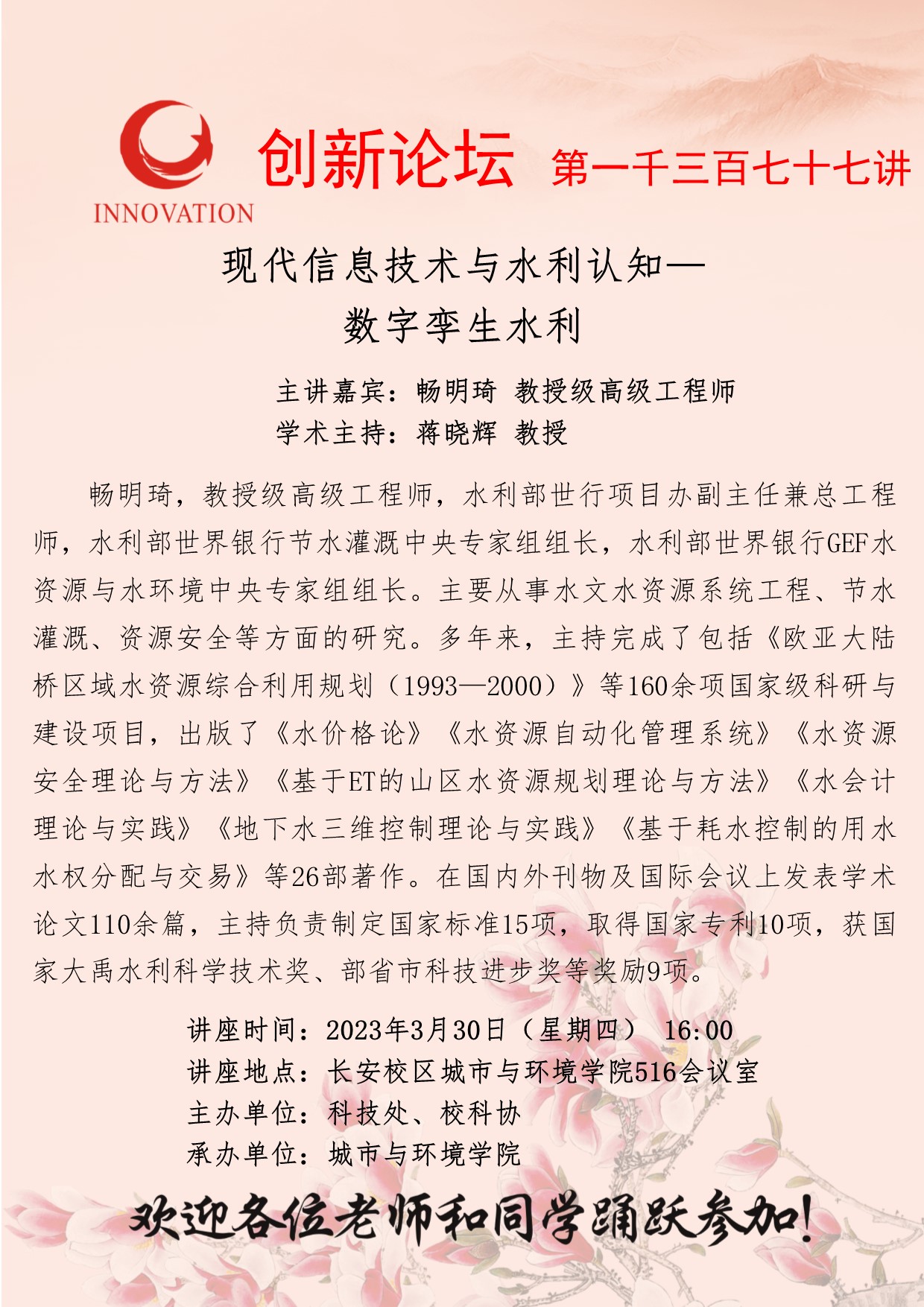 畅明琦 教授级高级工程师 乐动网页版登录入口创新论坛第一千三百七十七讲:现代信息技术与水利认知—数字孪生水利 讲座时间 2023年3月30日(星期四) 16:00 讲座地点 长安校区城市与环境学院516会议室 讲座人介绍 畅明琦 教授级高级工程师 讲座内容