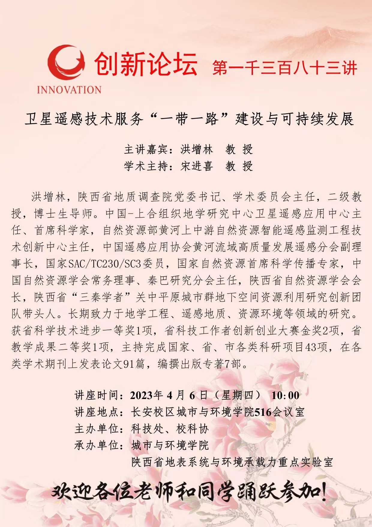 洪增林 教 授 乐动网页版登录入口创新论坛第一千三百八十三讲:卫星遥感技术服务“一带一路”建设与可持续发展 讲座时间 2023年 4 月 6 日(星期四) 10:00 讲座地点 长安校区城市与环境学院516会议室 讲座人介绍 洪增林 教 授 讲座内容