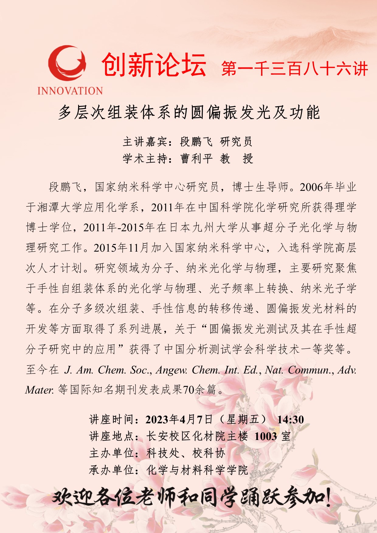 段鹏飞 研究员 乐动网页版登录入口创新论坛第一千三百八十六讲:多层次组装体系的圆偏振发光及功能应用 讲座时间 2023年4月7日(星期五) 14:30 讲座地点 长安校区化材院主楼 1003 室 讲座人介绍 段鹏飞 研究员 讲座内容