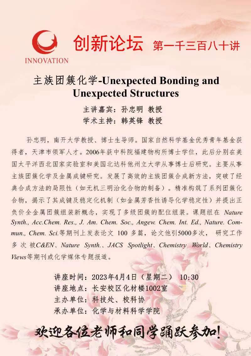 孙忠明 教授 乐动网页版登录入口创新论坛第一千三百八十讲:主族团簇化学-Unexpected Bonding and Unexpected Structures 讲座时间 2023年4月4日(星期二) 10:30 讲座地点 长安校区化材楼1002室 讲座人介绍 孙忠明 教授 讲座内容