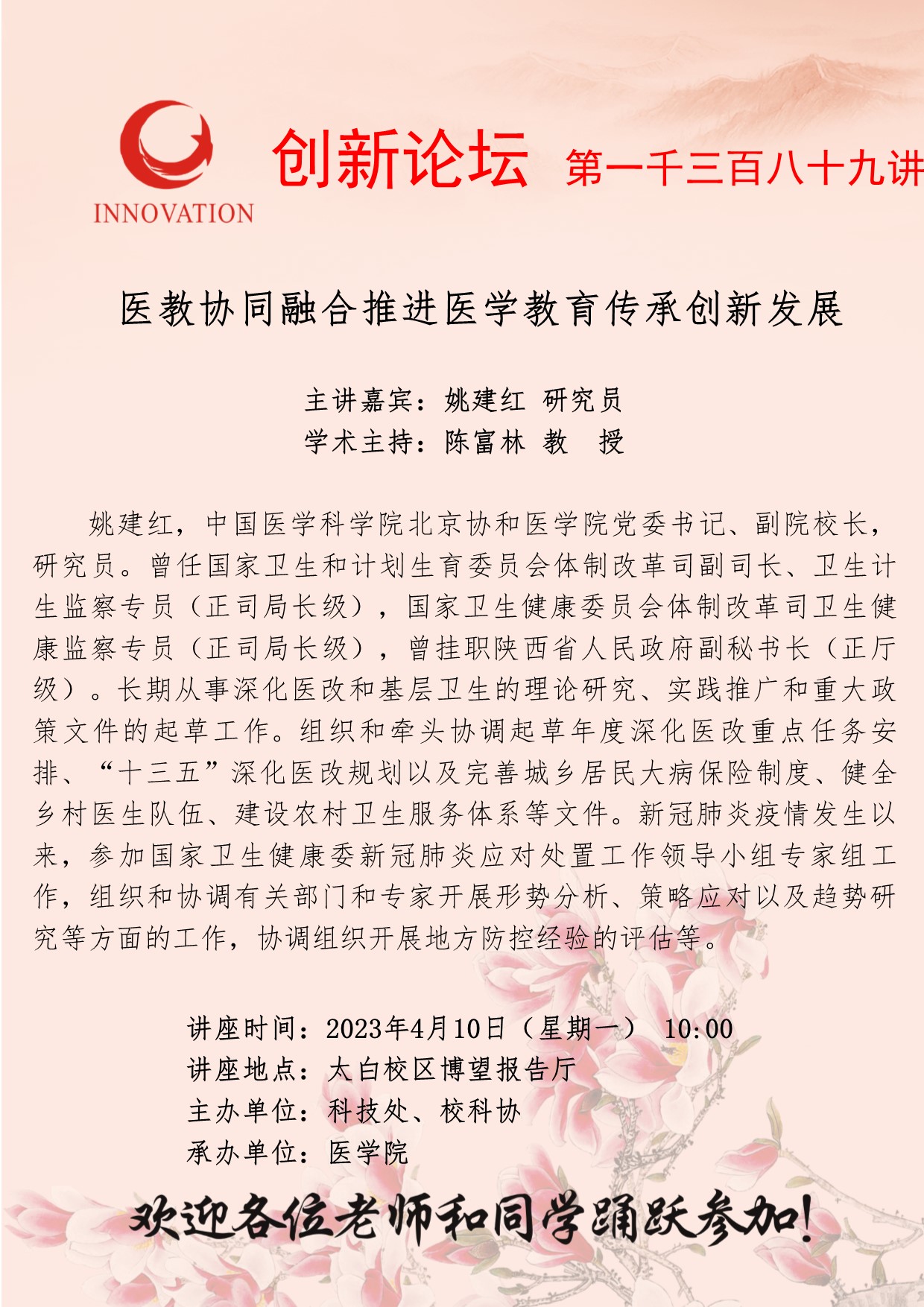 姚建红 研究员 乐动网页版登录入口创新论坛第一千三百八十九讲:医教协同融合推进医学教育传承创新发展 讲座时间 2023年4月10日(星期一) 10:00 讲座地点 太白校区博望报告厅 讲座人介绍 姚建红 研究员 讲座内容