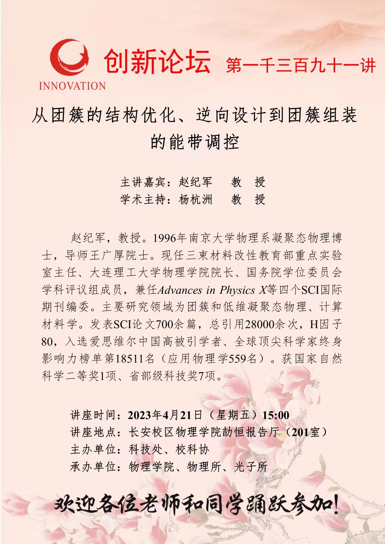 赵纪军 教 授 乐动网页版登录入口创新论坛第一千三百九十一讲:从团簇的结构优化、逆向设计到团簇组装的能带调控 讲座时间 2023年4月21日(星期五)15:00 讲座地点 长安校区物理学院劼恒报告厅(201室) 讲座人介绍 赵纪军 教 授 讲座内容
