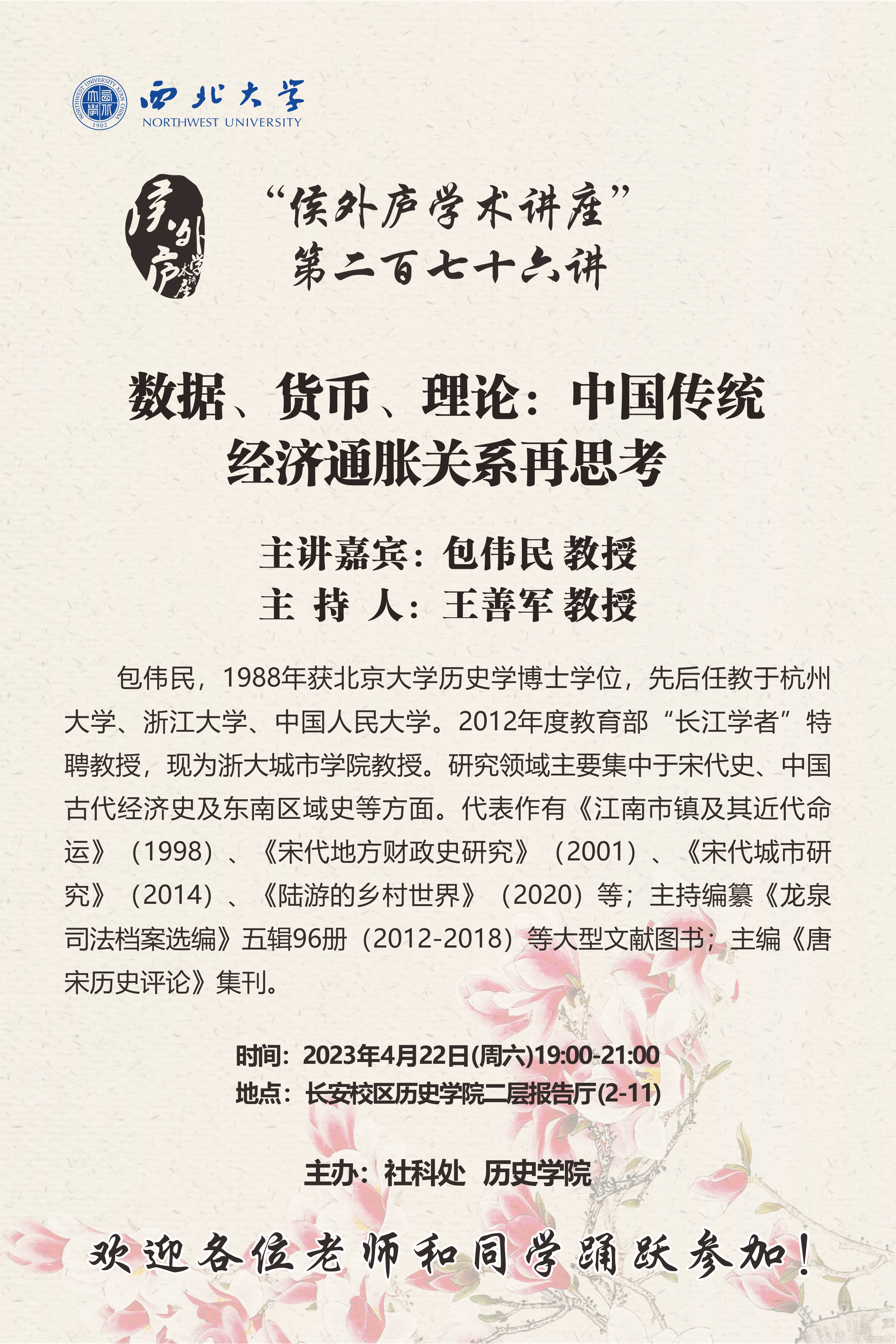 包伟民 教授 侯外庐学术讲座第二百七十六讲:数据、货币、理论:中国传统经济通胀关系再思考 讲座时间 2023年4月22日(周六)19:00 讲座地点 长安校区历史学院 二层报告厅(2-11) 讲座人介绍 包伟民 教授 讲座内容