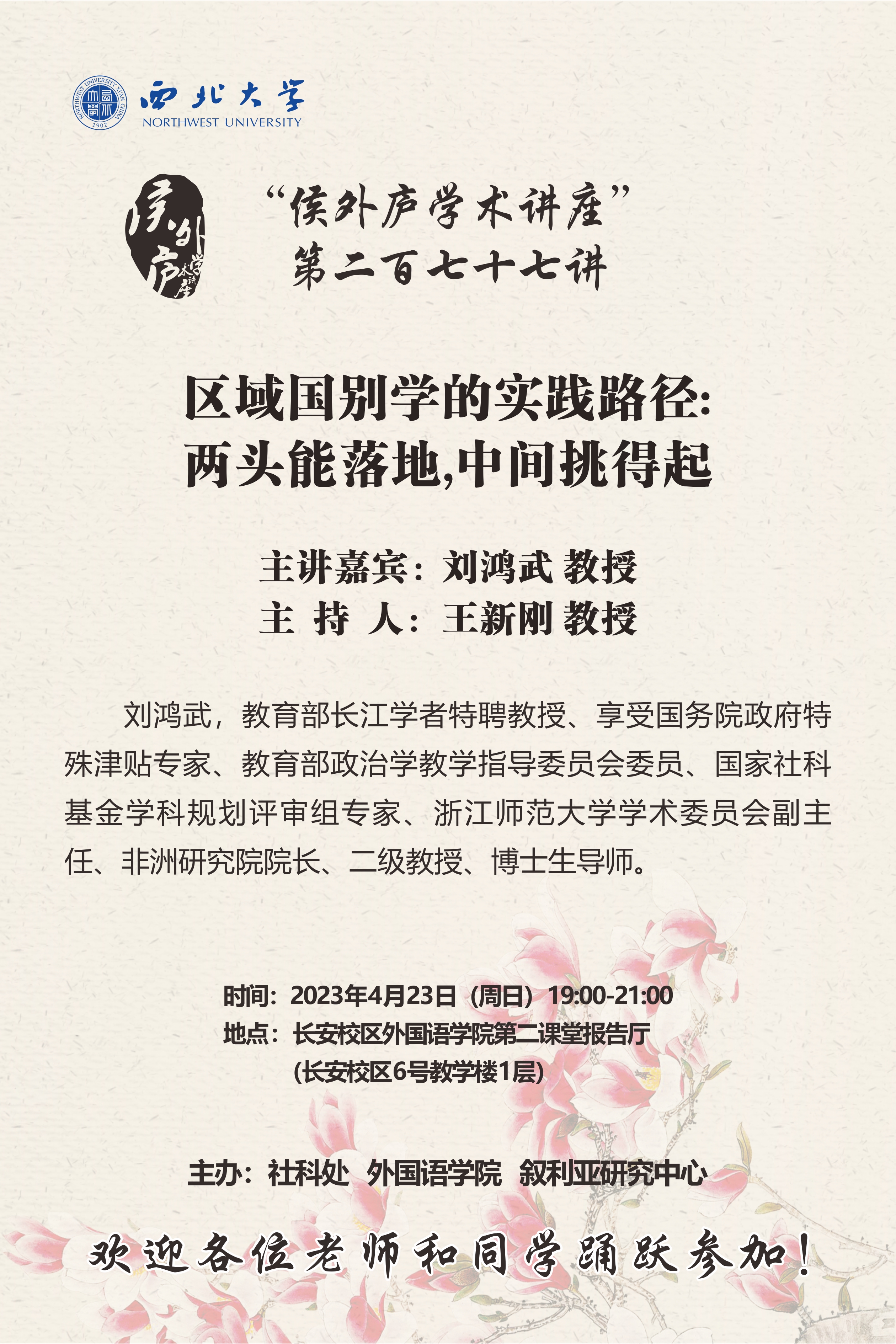 刘鸿武 教授 侯外庐学术讲座第二百七十七讲:区域国别学的实践路径:两头能落地,中间挑得起 讲座时间 2023年4月23日(周日)19:00 讲座地点 乐动网页版登录入口外国语学院第二课堂报告厅 讲座人介绍 刘鸿武 教授 讲座内容