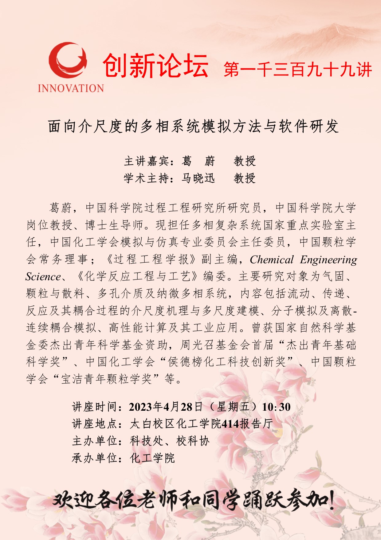 葛蔚 教授 乐动网页版登录入口创新论坛第一千三百九十九讲:面向介尺度的多相系统模拟方法与软件研发 讲座时间 2023年4月28日(星期五)10:30 讲座地点 太白校区化工学院414报告厅 讲座人介绍 葛蔚 教授 讲座内容