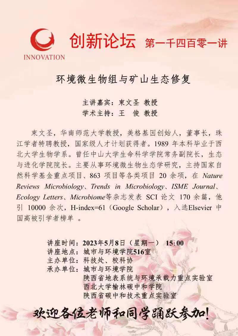 束文圣 教授 乐动网页版登录入口创新论坛第一千四百零一讲:环境微生物组与矿山生态修复 讲座时间 2023年5月8日(星期一) 15:00 讲座地点 城市与环境学院516室 讲座人介绍 束文圣 教授 讲座内容