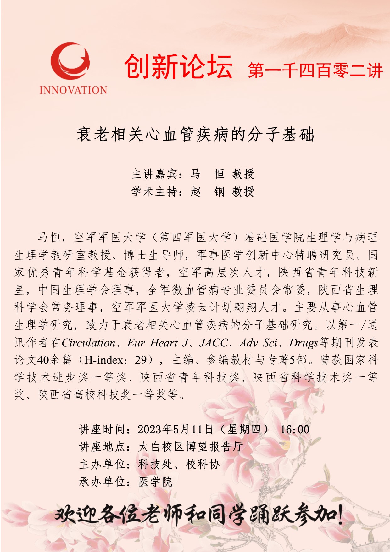 马恒 教授 乐动网页版登录入口创新论坛第一千四百零二讲:衰老相关心血管疾病的分子基础 讲座时间 2023年5月11日(星期四) 16:00 讲座地点 太白校区博望报告厅 讲座人介绍 马恒 教授 讲座内容