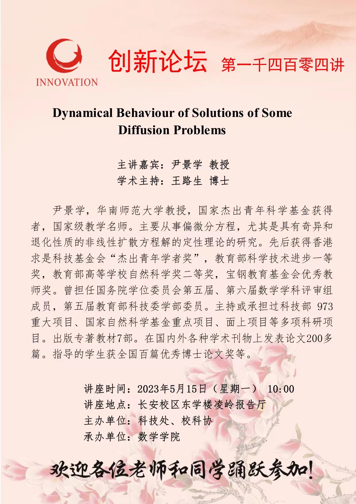 尹景学 教授 乐动网页版登录入口创新论坛第一千四百零四讲:Dynamical Behaviour of Solutions of Some Diffusion Problems 讲座时间 2023年5月15日(星期一) 10:00 讲座地点 长安校区东学楼凌岭报告厅 讲座人介绍 尹景学 教授 讲座内容