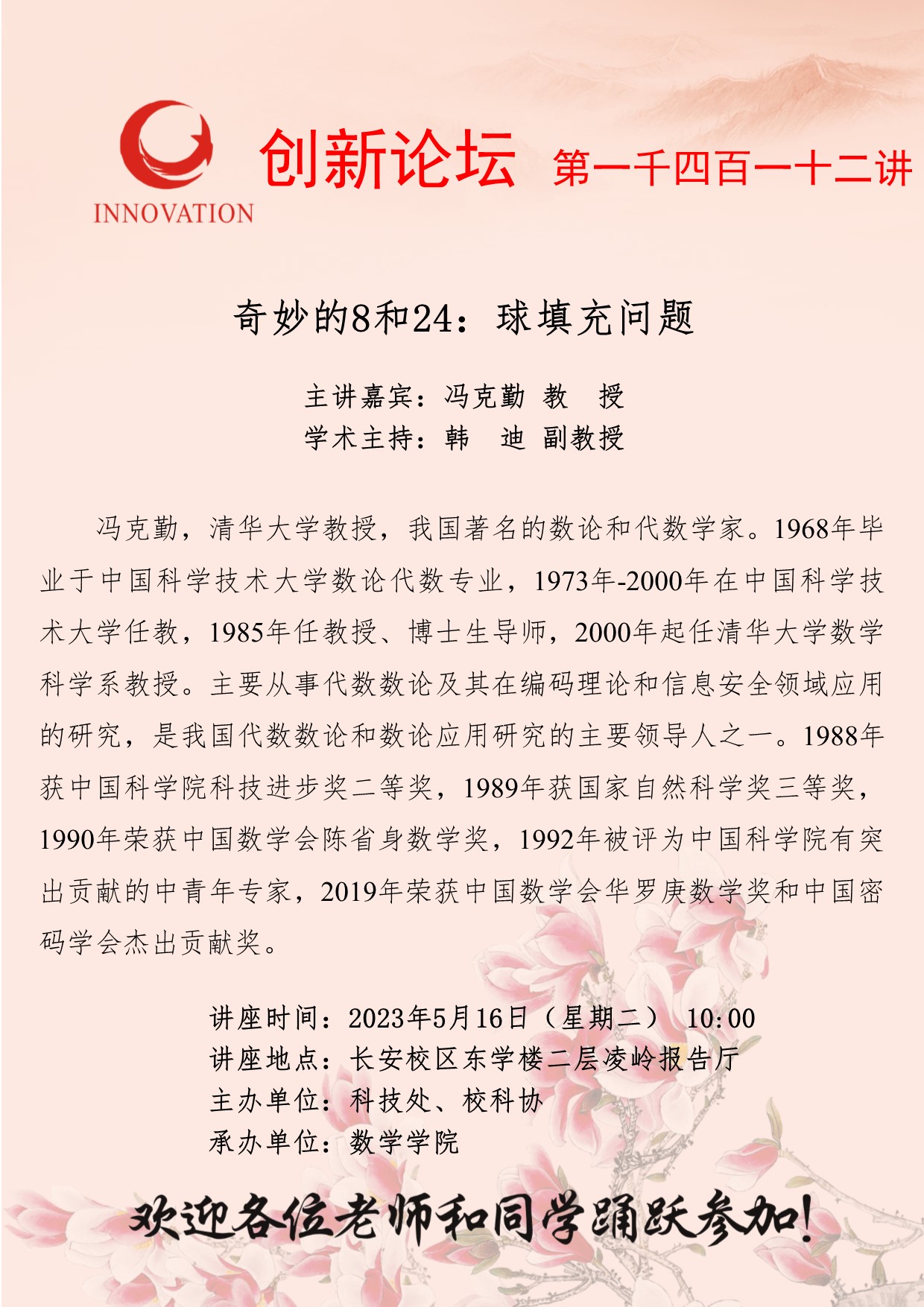 冯克勤 教授 乐动网页版登录入口创新论坛第一千四百一十二讲:奇妙的8和24:球填充问题 讲座时间 2023年5月16日(星期二)10:00 讲座地点 长安校区东学楼二层凌岭报告厅 讲座人介绍 冯克勤 教授 讲座内容
