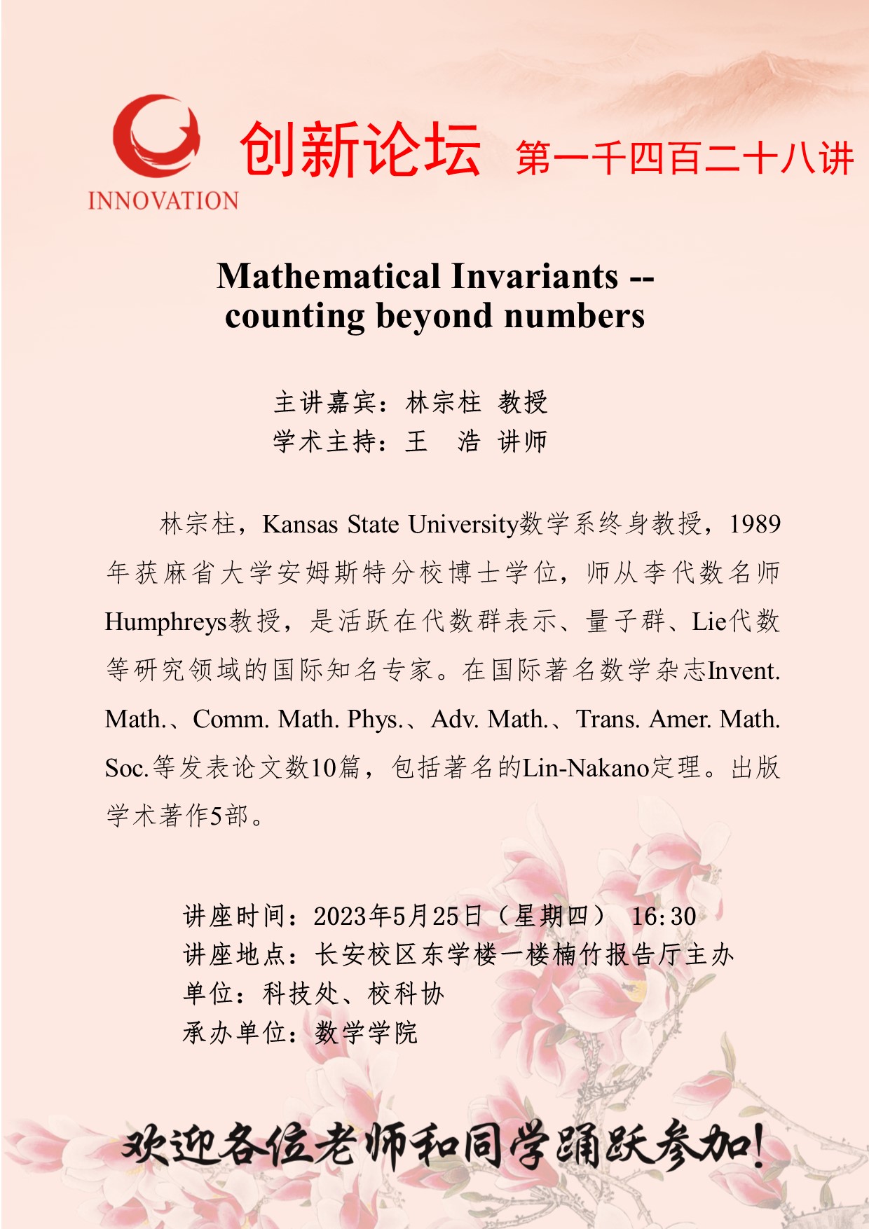 林宗柱 教授 乐动网页版登录入口创新论坛第一千四百二十八讲:Mathematical Invariants --counting beyond numbers 讲座时间 2023年5月25日(星期四)16:30 讲座地点 长安校区东学楼一楼楠竹报告厅 讲座人介绍 林宗柱 教授 讲座内容